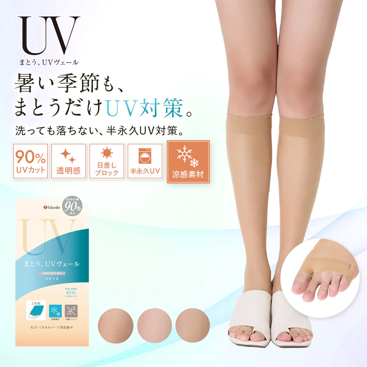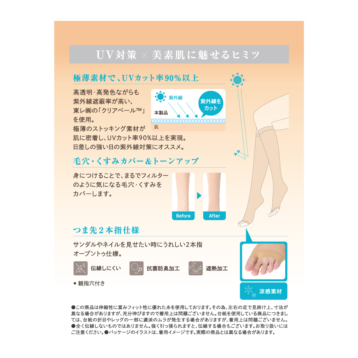 毎日の紫外線対策を、もっと手軽に。365日、絶え間なく降り注ぐ紫外線、日々忙しく過ごす中でも、しっかりと紫外線対策をしたい。そんなあなたの生活に寄り添いながら、手間をかけずに肌を守る新感覚のUVケアブランドが誕生。「まとう、UVヴェール」高透明・高発色ながらも紫外線遮蔽率が高いストッキングのような極薄生地でUV遮蔽率90%以上を実現。肌に密着し、まるで着けていないような自然な見た目で、ファンデーションのように気になる毛穴・キズ・くすみをカバーしてくれます。涼感素材と遮熱機能で暑さと強い日差しの季節にピッタリです。抗菌防臭加工でニオイ対策もGOOD!つま先が開いているオープントゥタイプなのでサンダル等でも合わせやすいですよ。