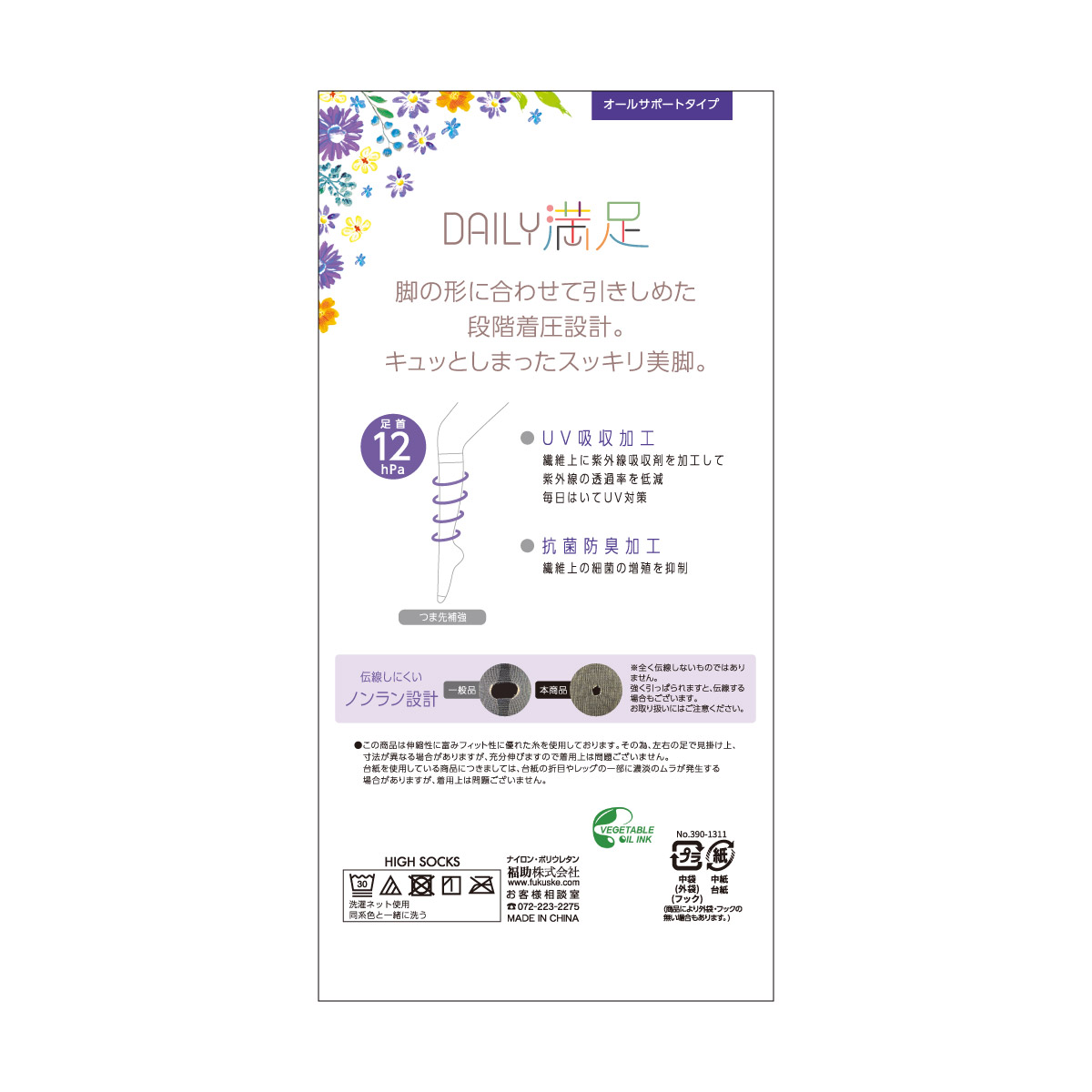「満足」のセカンドライン「DAILY満足シリーズ」です。すべて多足組ですので、コスパ重視の方にもおすすめ。このショートストッキングは、足元の美しさをサポートする着圧機能と、日常使いに嬉しい耐久性を兼ね備えた3足組です。なめらかで肌触りの良いSCYゾッキ編みを採用し、快適な履き心地を実現しました。伝線しにくいノンラン設計を施しているため、伝線の不安を軽減し、立ち仕事や外出時も安心です。一番の特長は、足元をすっきり引き締める着圧設計です。足首部分に12hPaの適切な圧力をかけることで、心地よくフィットし、美脚をサポートします。また、摩擦を受けやすいつま先には補強を施しており、耐久性を高めています。衛生面にも配慮した抗菌防臭加工により気になるニオイを抑え、さらにUV吸収加工も施されているため、足元の紫外線対策としても役立ちます。大変便利な3足組でお届けしますので、洗い替えに困ることなく、毎日の必需品としてご活用いただけます。