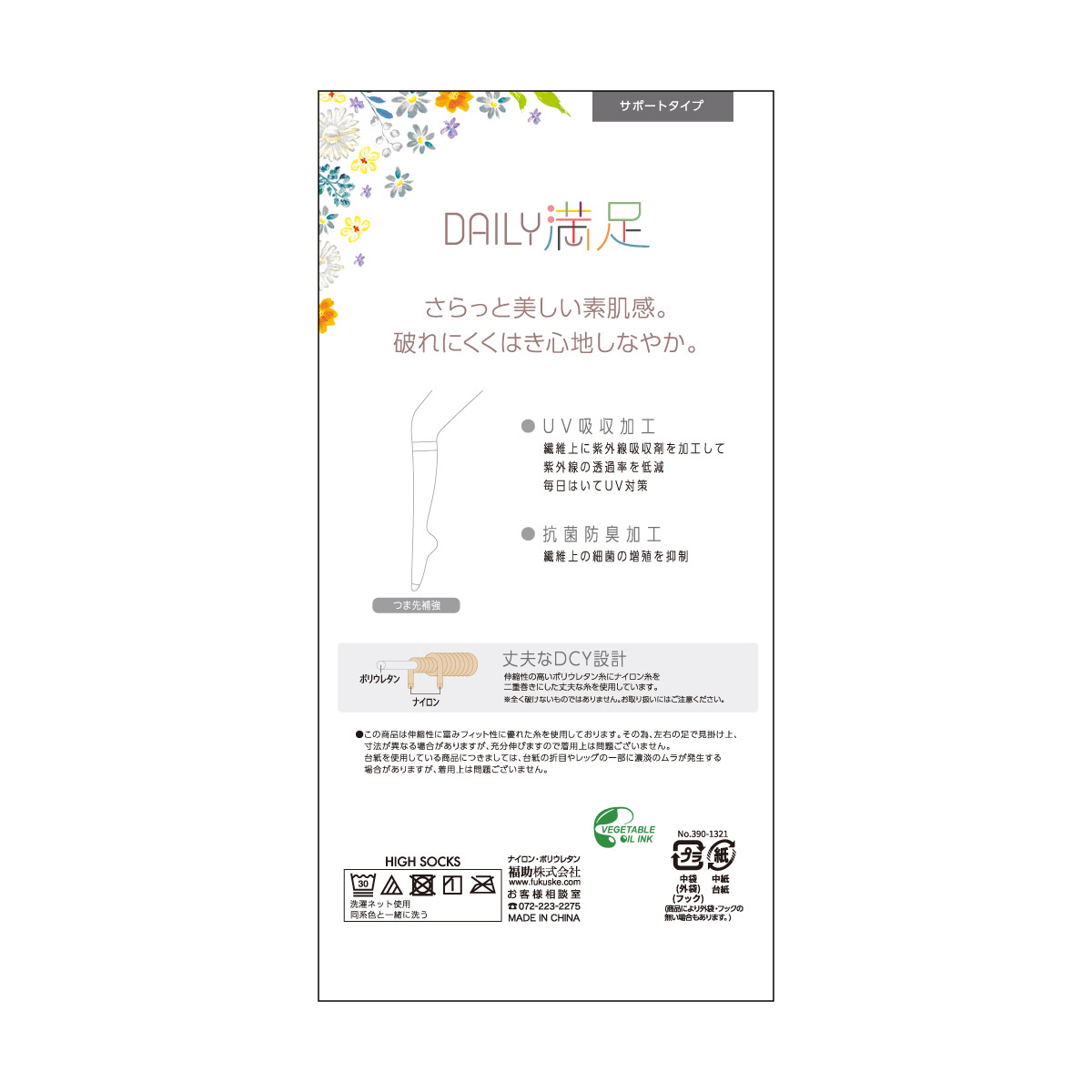 「満足」のセカンドライン「DAILY満足シリーズ」です。すべて多足組ですので、コスパ重視の方にもおすすめ。このショートストッキングは、日常の快適さと丈夫さを追求したベーシックな3足組です。素材には、伸縮性と耐久性に優れたDCY交編(ダブルカバリングヤーン)を採用しており、脚に心地よくフィットしながら、高いサポート力と丈夫さを実現しました。靴の中で摩擦を受けやすいつま先には、しっかりと補強が施されており、破れにくく耐久性が高いため、毎日のご使用に最適です。さらに、衛生面を考慮した抗菌防臭加工により気になるニオイを抑え、UV吸収加工も施されているため、足元の紫外線対策としてもご活用いただけます。便利な3足組でお届けしますので、洗い替えに困ることなく、高いコストパフォーマンスでご使用いただけます。日常使いのパンプスやスニーカーと合わせて、快適な足元のおしゃれをお楽しみください。