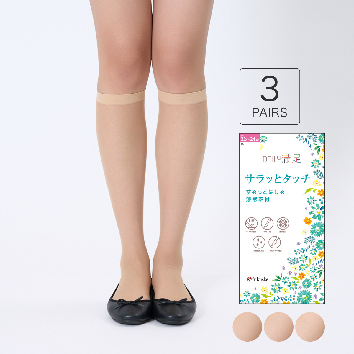 「満足」のセカンドライン「DAILY満足シリーズ」です。すべて多足組ですので、コスパ重視の方にもおすすめ。このショートストッキングは、暑い季節の足元を涼しく、美しく保つために機能性を凝縮した3足組です。素材には、なめらかな肌触りのナイロンゾッキ編みを採用し、心地よいフィット感を実現しています。最大の特長は、暑さ対策として涼感加工が施されている点です。これにより、着用時にひんやりとした感触があり、夏の足元のムレを軽減します。耐久性にも配慮し、摩擦を受けやすいつま先にはシアー補強が施されています。見た目の透明感を保ちつつ、破れにくさを向上させています。また、抗菌防臭加工により気になるニオイを抑え、さらにUV吸収加工も施されているため、日差しの強い季節の紫外線対策としても安心してお使いいただけます。大変お得で便利な3足組でのお届けですので、洗い替えに困ることなく、毎日の必需品としてご活用いただけます。パンプスやサンダルなどと合わせて、夏の足元のおしゃれを快適にお楽しみください。