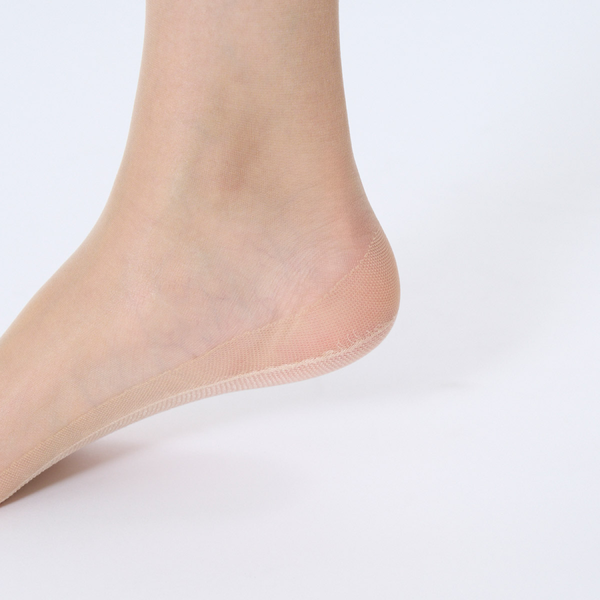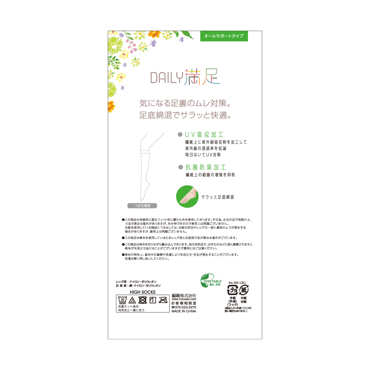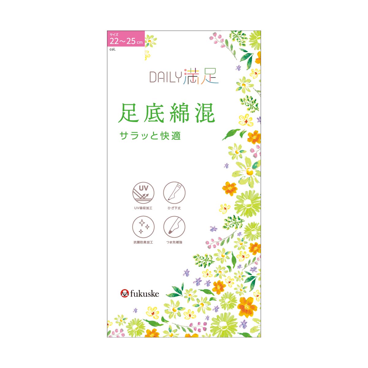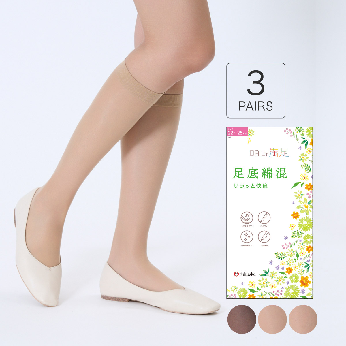 「満足」のセカンドライン「DAILY満足シリーズ」です。すべて多足組ですので、コスパ重視の方にもおすすめ。このショートストッキングは、ストッキングの美しい見た目と、靴下の快適さを両立させた機能的な3足組です。ストッキング本体には、なめらかで肌触りの良いSCYゾッキ編みを採用し、心地よく脚にフィットします。最大の特長は、足裏部分に綿(コットン)素材を使用している点です。これにより、ムレやすい足底の汗をしっかりと吸い取り、一日中さらっと快適な履き心地を保ちます。また、立体的な履き心地を生む足型セット加工が施されており、足の形にフィットして美しく着用できます。摩擦を受けやすいつま先には補強を施し、耐久性も高めています。衛生面にも配慮し、抗菌防臭加工により気になるニオイを抑えるため安心です。さらに、UV吸収加工も施されているため、足元の紫外線対策としても役立ちます。大変便利な3足組でお届けしますので、洗い替えに困らず、毎日の必需品としてご活用いただけます。