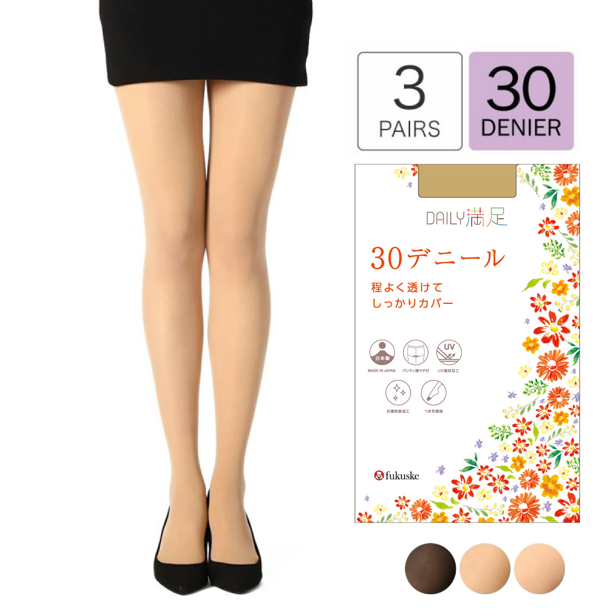「満足」のセカンドライン「DAILY満足シリーズ」です。すべて多足組ですので、コスパ重視の方にもおすすめ。このストッキングは、30デニールの程よい厚みで、素肌を自然にカバーしながらも、様々な機能で日々の快適さをサポートする3足組です。なめらかで肌触りの良いSCYゾッキ編みを採用しており、脚全体に心地よくフィットします。長時間の着用でも快適に過ごせるよう、股の部分はパンティ部立体仕様とマチ付き設計になっており、締め付けすぎずゆったりとした履き心地を実現しています。また、後ろ側に付いたネームにより、忙しい朝でもストッキングの前後を簡単に見分けられます。ストッキング全体に立体感を与える足型セット加工が施されているため、脚に美しくフィットします。さらに、摩擦を受けやすいつま先には補強を施し、耐久性を向上させています。衛生面にも配慮し、抗菌防臭加工により気になるニオイを抑え、UV吸収加工も施されているため、紫外線対策としても役立ちます。大変便利な3足組でお届けしますので、洗い替えに困ることなく、高いコストパフォーマンスで毎日の必需品としてご活用いただけます。