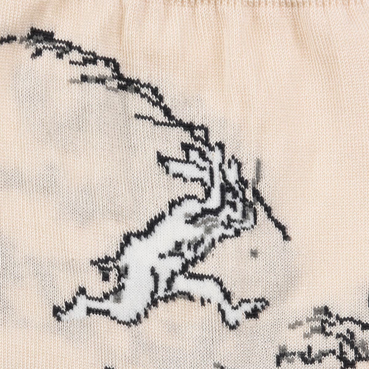 約800年前に描かれた日本で最も有名な絵巻で現代のマンガのルーツとも言われている『国宝・鳥獣戯画』をモチーフにしたクルー丈ソックスです。右足と左足を並べると有名な絵巻の一部になるユニークな一足です。