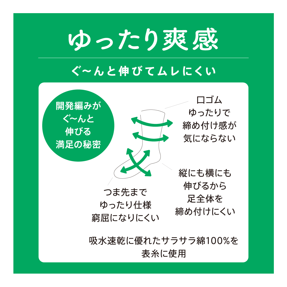 ぐーんと伸びて蒸れにくいから足もと快適で心地よいゆったり爽感シリーズのソックスです。表糸は肌離れが良く汗を素早く吸いやすいサラサラの綿100%使用。履き口はもちろん足全体がゆったりした開発した編み方で窮屈になりにくく縦にも横にも伸びるストレッチ性がクセになる一足です。