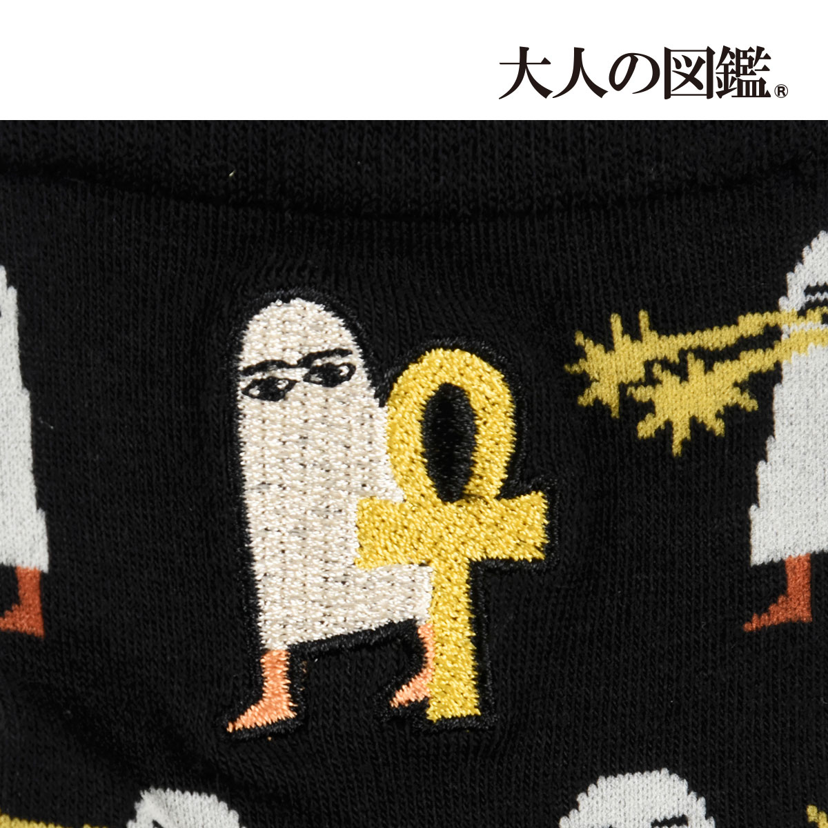 「満たして大人の好奇心」をキャッチフレーズにニッチなテーマを解説付きの図鑑風デザインにしたシールから始まったシリーズが、大好評につきシールにとどまらず様々な雑貨に展開!ついに靴下で登場しました。古代エジプトの大人気なメジェドとアンクを総柄にいたしました。