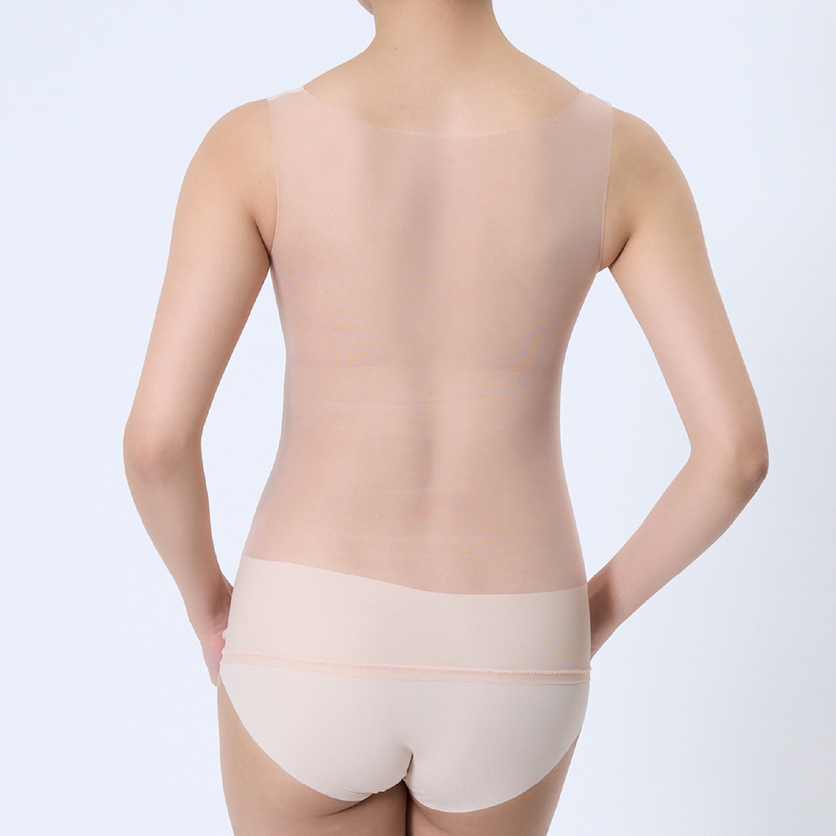 「素肌を直接魅せるのは恥ずかしい!」「美肌に見せたい」というお悩みに応え、着用する事でお肌をキレイにカバーし、まるでレタッチ効果のように見せてくれる、美カップ付きタンクトップです。肌馴染みの良いスキントーンで、インナーに悩みがちな肌魅せコーデにピッタリの一枚です。最大の特長は、軽い付け心地でありながら、美カップ付きで胸すっきりキレイ魅せと、バストをキレイに支える欲張り設計を両立させている点です。カップは脇高設計のため、就寝時や動いている時もバストが横流れしにくい構造です。さらに、カップ下にはしっかりアンダーメッシュテープを配し、安定してバストを支えます。また、カップの前中心が繋がっている設計でバストトップが広がりにくく、パワーネットパーツがバストを優しく持ち上げ、美胸に整えます。脇部分には2重パネルを配し、胸脇をスッキリと押さえて脇肉が広がりにくい設計です。このように多機能でありながら、胸部がシームレスな設計のため、薄手のトップスやぴったりしたアウターを着用してもラインが響きにくいのも魅力です。素肌をキレイにカバーしつつ、バストラインも整える、まさに理想的なインナーウェアです。