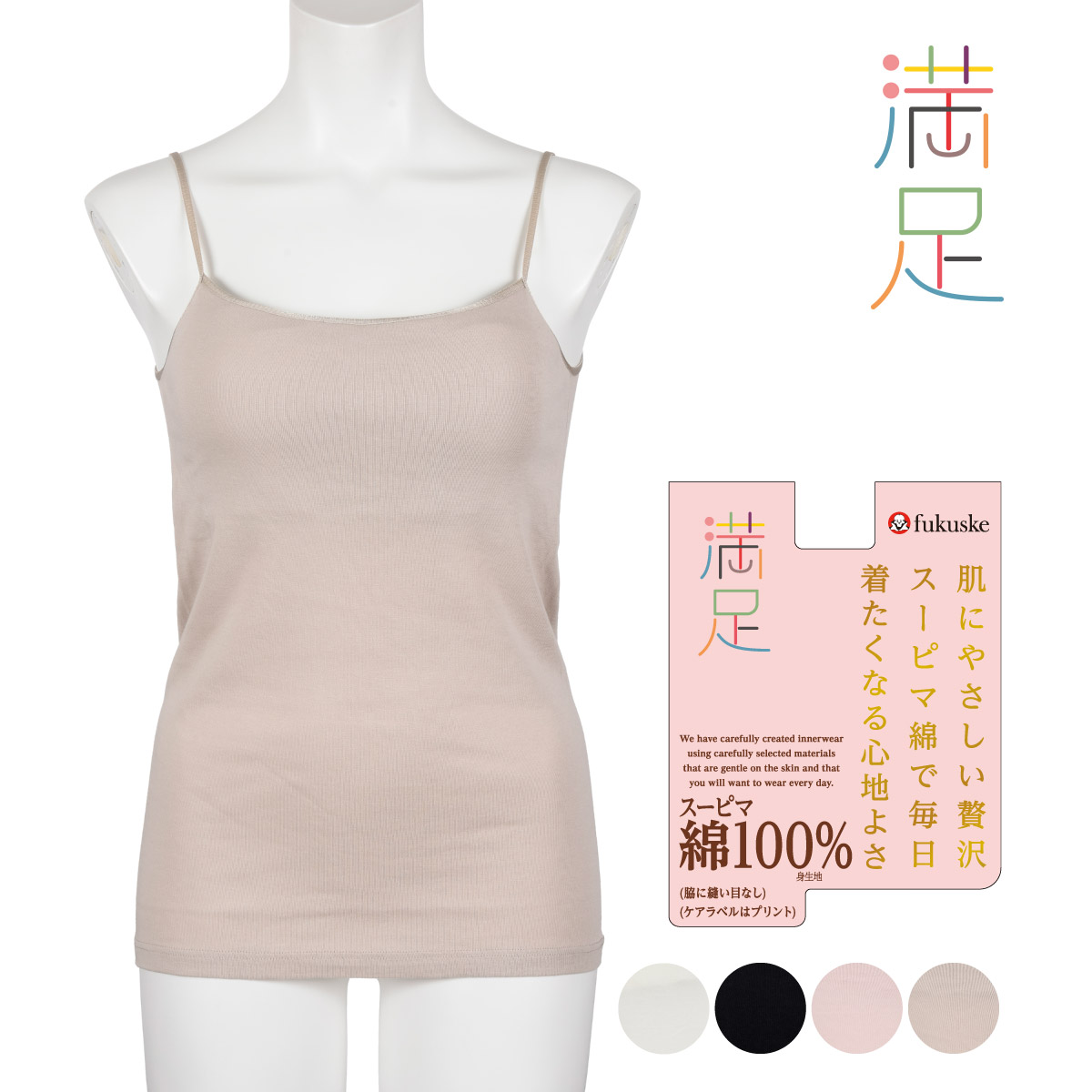 【満足(マンゾク)】 カップ付きキャミソール 無地 袖なし スーピマ綿100% タグなし 転写プリント 脇に縫い目なし(37-1001)