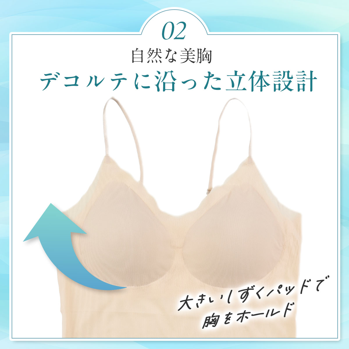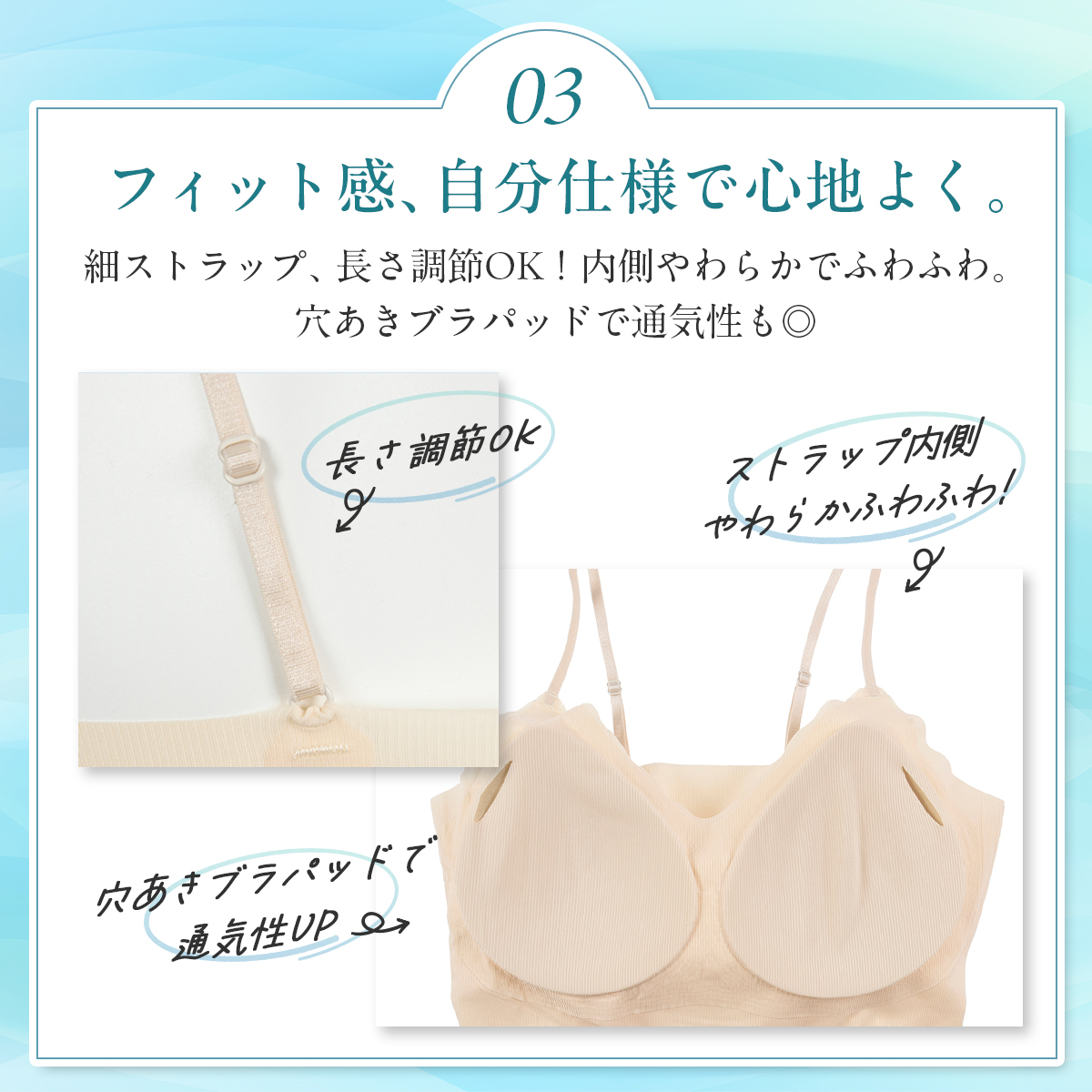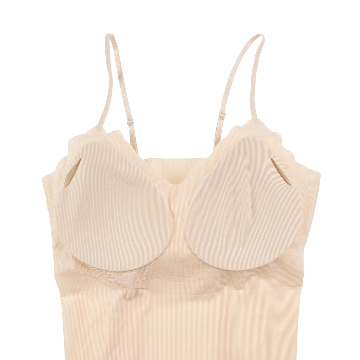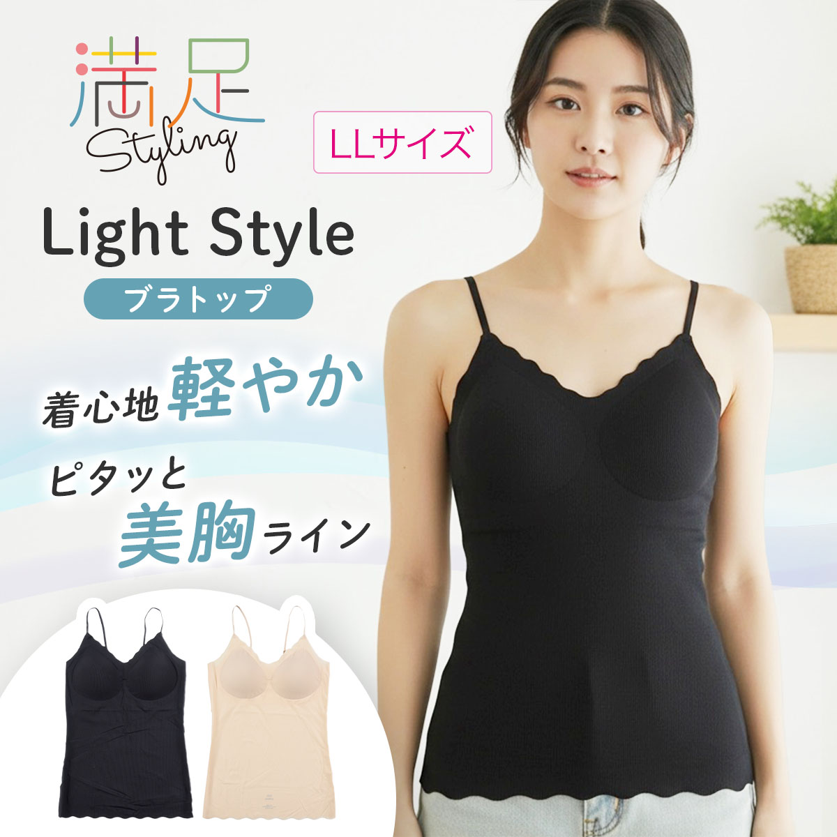 「満足スタイリング Light Style」は、軽やかさと美しさを両立させた、ストレスフリーなカップ付きキャミソールです。着心地軽やかで、軽うす美胸を叶えます。このキャミソールは、シームレス設計によるシンプルなデザインと、軽くて薄い通気性が良い素材により、タイトなアウターにも響きにくく、美しいシルエットを保ちます。フィット感のある優しい着用感なので締め付けにくく、デイリーユースに最適です。ノンワイヤーでありながら、胸キレイにホールドする立体設計はバストを優しく包み込み、ピタッと美胸ラインをサポート。胸を優しくキレイに包みます。脇部分はハミ肉が出にくい脇高設計となっており、気になる部分をすっきり整えます。通気性にも優れており、生地の薄さだけでなく、穴あきタイプの軽いカップを採用することでムレにくく、暑い日も最適です。肩紐は細めのストラップを採用し、長さが調整できるのでお好みの着用感で着こなして頂けます。薄手の生地でありながらバスト全体をホールドする新感覚の着心地インナーです。