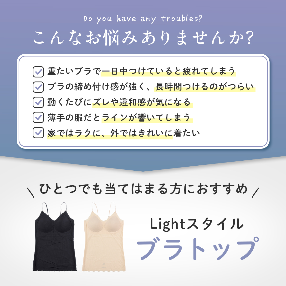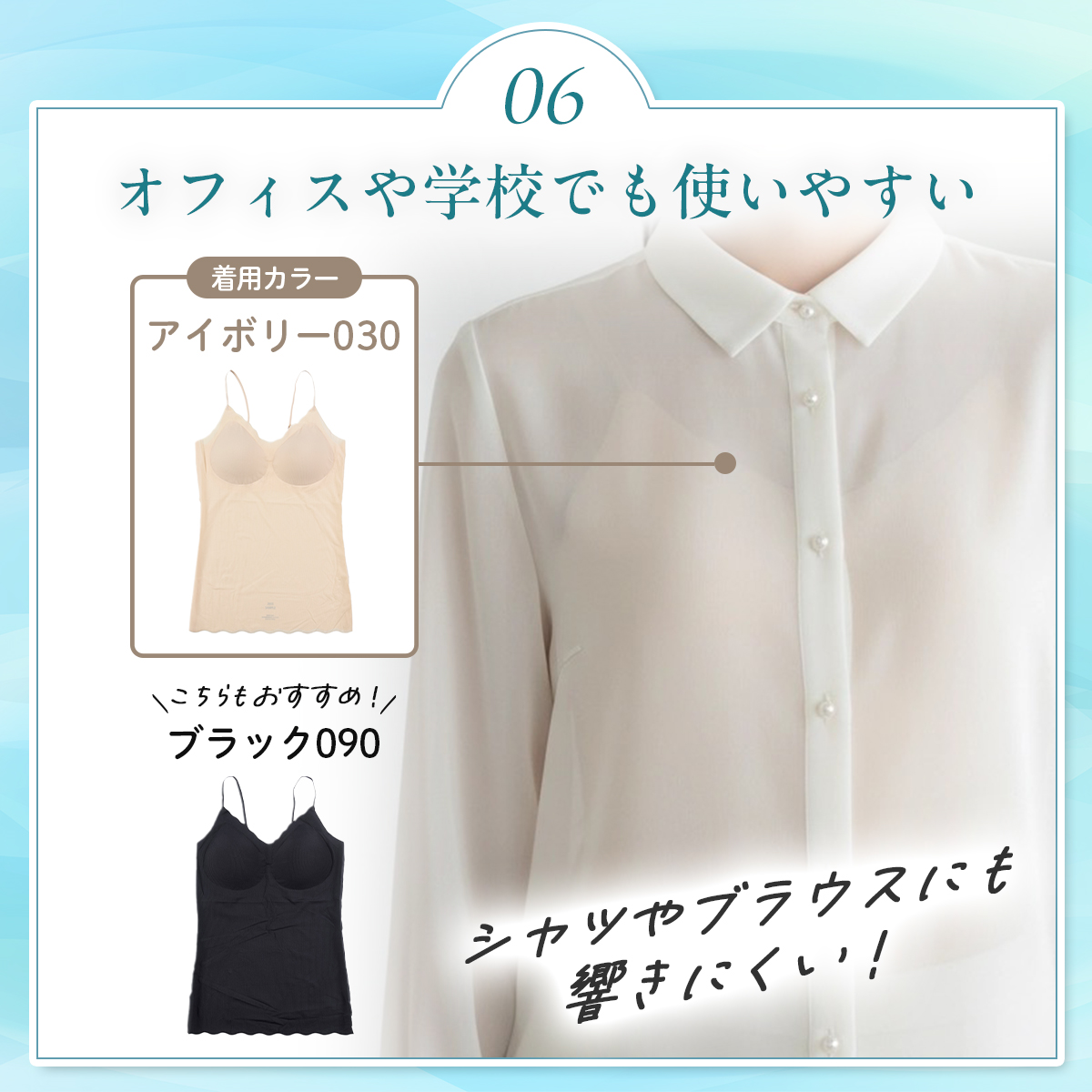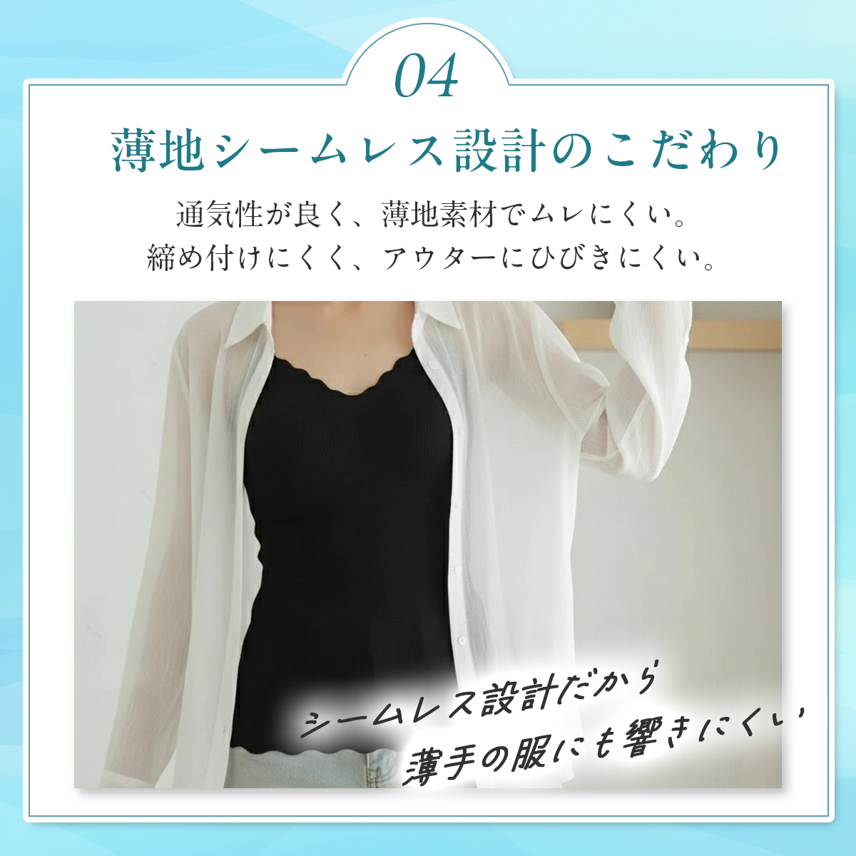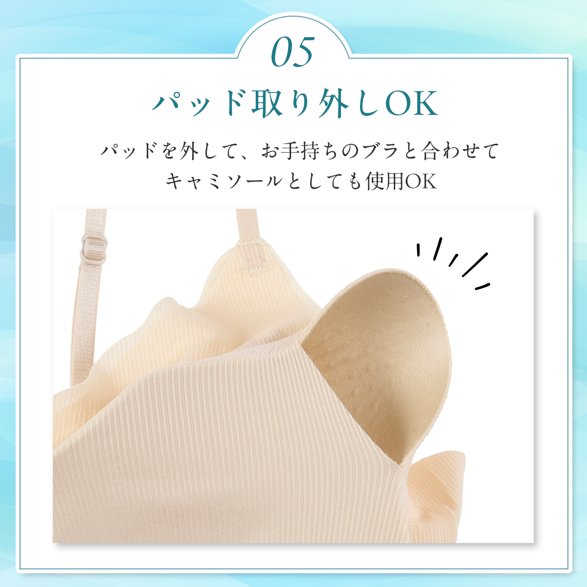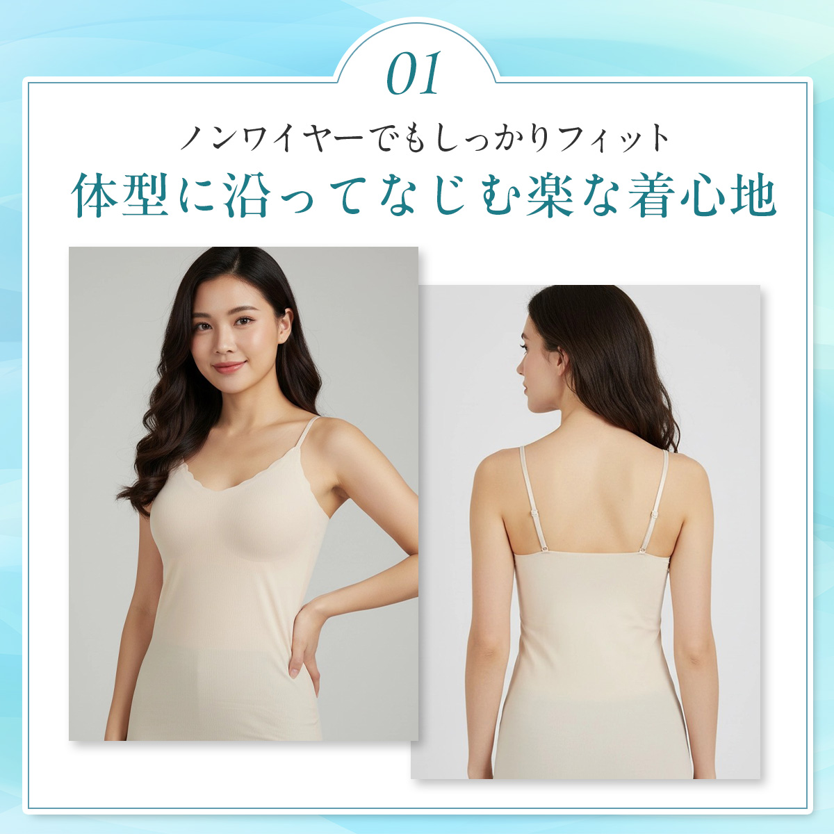 「満足スタイリング Light Style」は、軽やかさと美しさを両立させた、ストレスフリーなカップ付きキャミソールです。着心地軽やかで、軽うす美胸を叶えます。このキャミソールは、シームレス設計によるシンプルなデザインと、軽くて薄い通気性が良い素材により、タイトなアウターにも響きにくく、美しいシルエットを保ちます。フィット感のある優しい着用感なので締め付けにくく、デイリーユースに最適です。ノンワイヤーでありながら、胸キレイにホールドする立体設計はバストを優しく包み込み、ピタッと美胸ラインをサポート。胸を優しくキレイに包みます。脇部分はハミ肉が出にくい脇高設計となっており、気になる部分をすっきり整えます。通気性にも優れており、生地の薄さだけでなく、穴あきタイプの軽いカップを採用することでムレにくく、暑い日も最適です。肩紐は細めのストラップを採用し、長さが調整できるのでお好みの着用感で着こなして頂けます。薄手の生地でありながらバスト全体をホールドする新感覚の着心地インナーです。