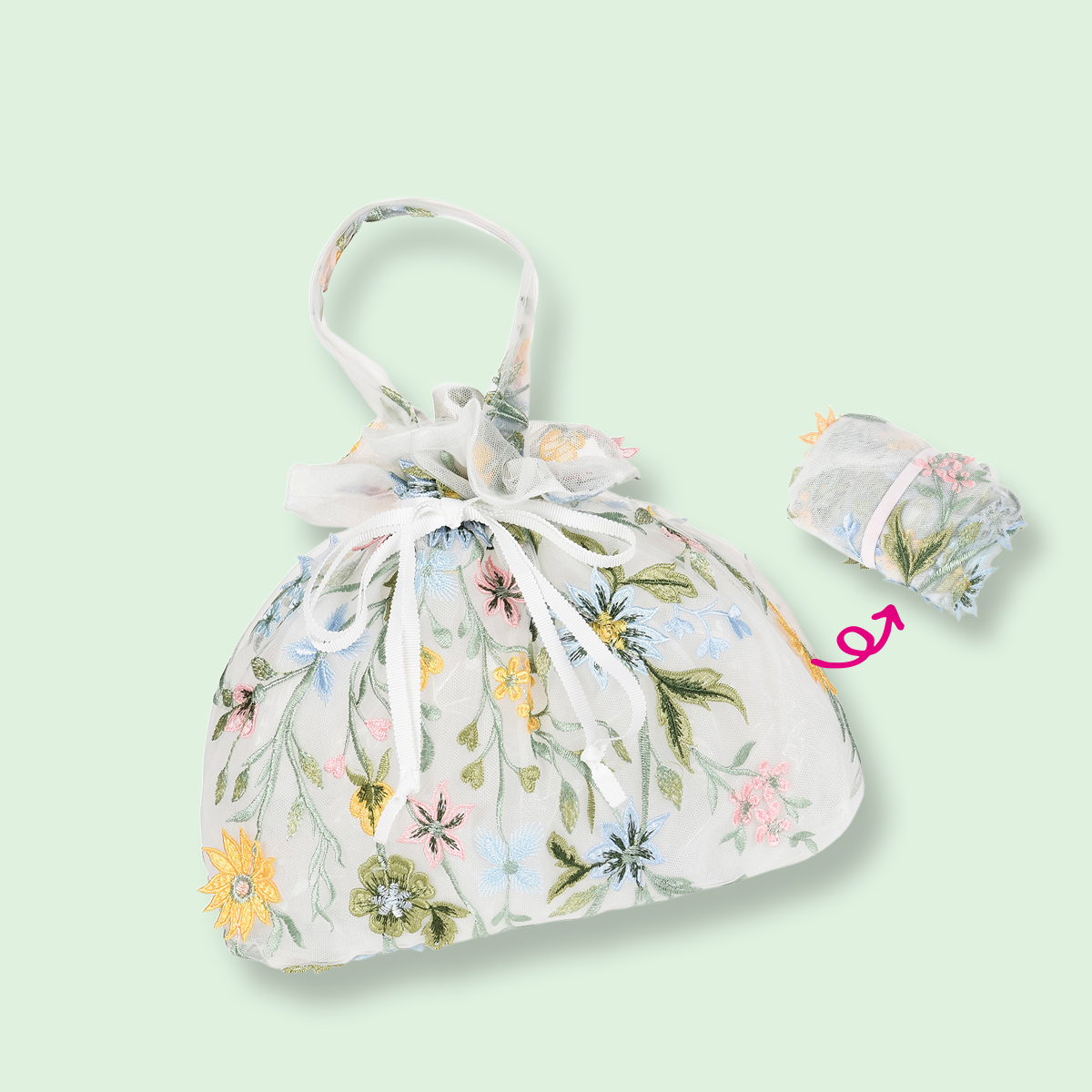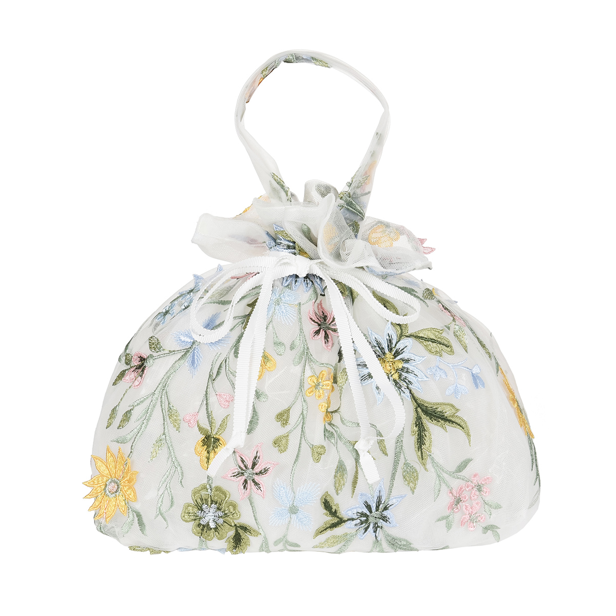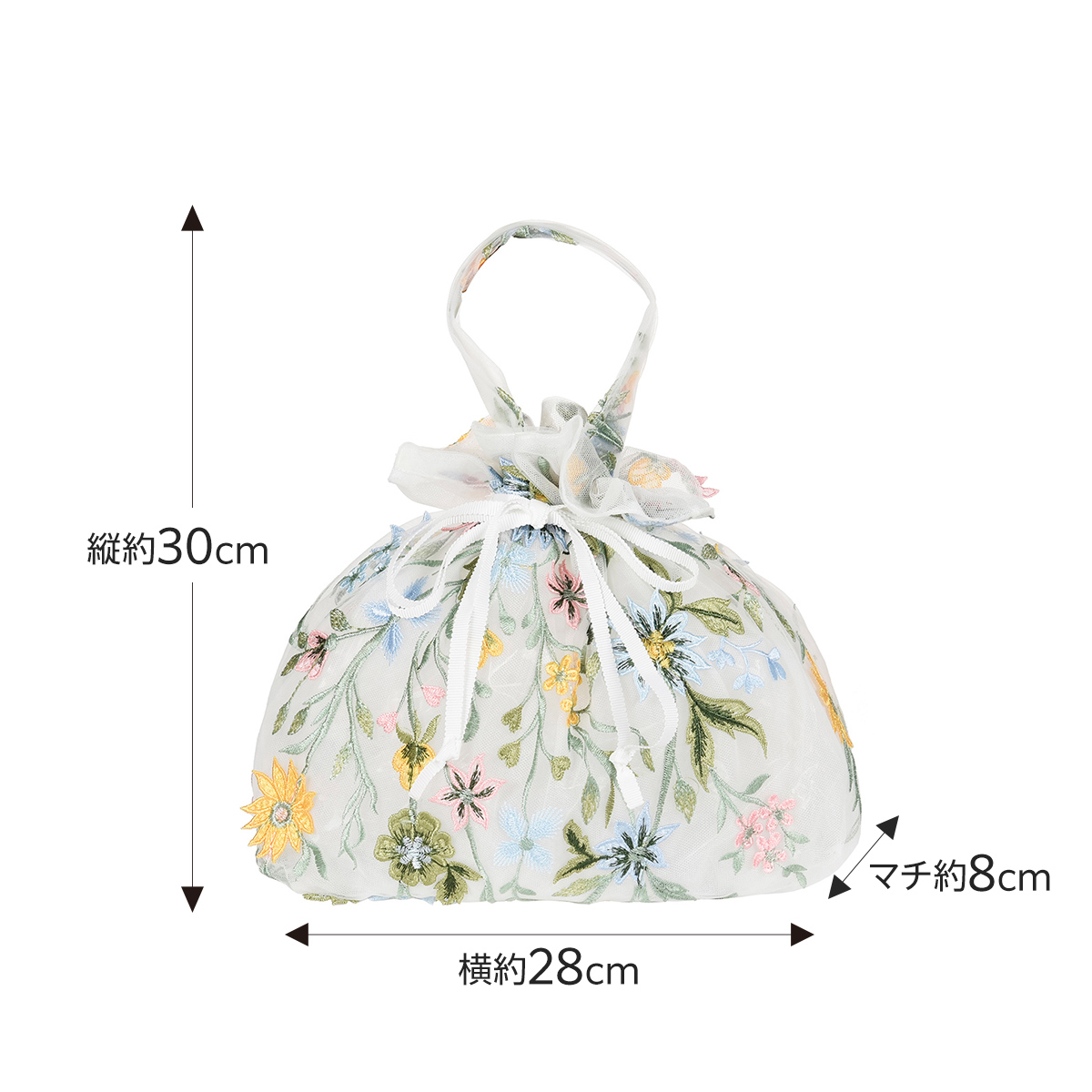 特徴・巾着タイプ・ペールフラワー柄・チュール素材
