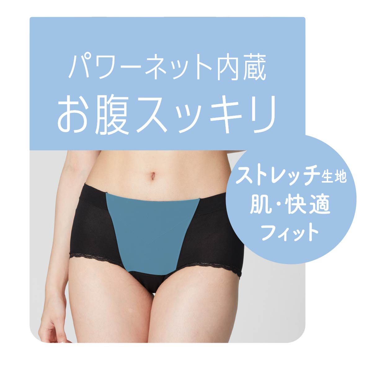 このサニタリーショーツは、生理中のデリケートな日も、快適なフィット感とスタイルアップ機能を両立させたスタンダードショーツです。本体には伸縮性に優れたストレッチ生地を採用し、肌に快適にフィットします。特に気になるお腹周りには、パワーネットを内蔵することで、優しく引き締めながらお腹をすっきりと見せるスタイルアップ効果があります。マチ部分は、衛生面に配慮した抗菌加工が施されているため、安心してご使用いただけます。履き心地の良さと機能性を兼ね備えた設計で、生理中でも普段と変わらない安心感と快適なボディラインをキープしたい方に最適な一枚です。