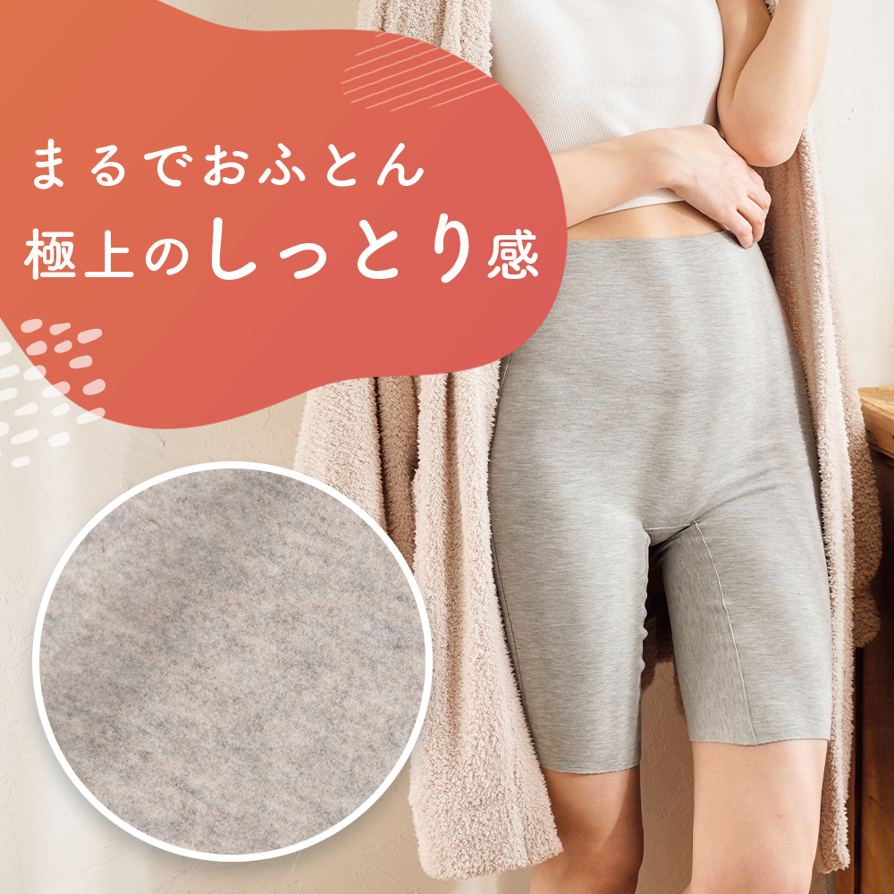 美温活「おふとん心地」シリーズのお腹部分シームレス設計でごろつきにくくお腹からお尻、太もも部分までしっかりあたためる軽い着心地の五分丈インナーボトムです。適度にフィットする生地で着膨れしにくく、綿混のマチがついているのでショーツとの重ねばきでなくても普通のショーツとしてもスッキリ履いていただけます。吸湿発熱素材と肌側微起毛でふわっと包み込んであたたかい1枚です。