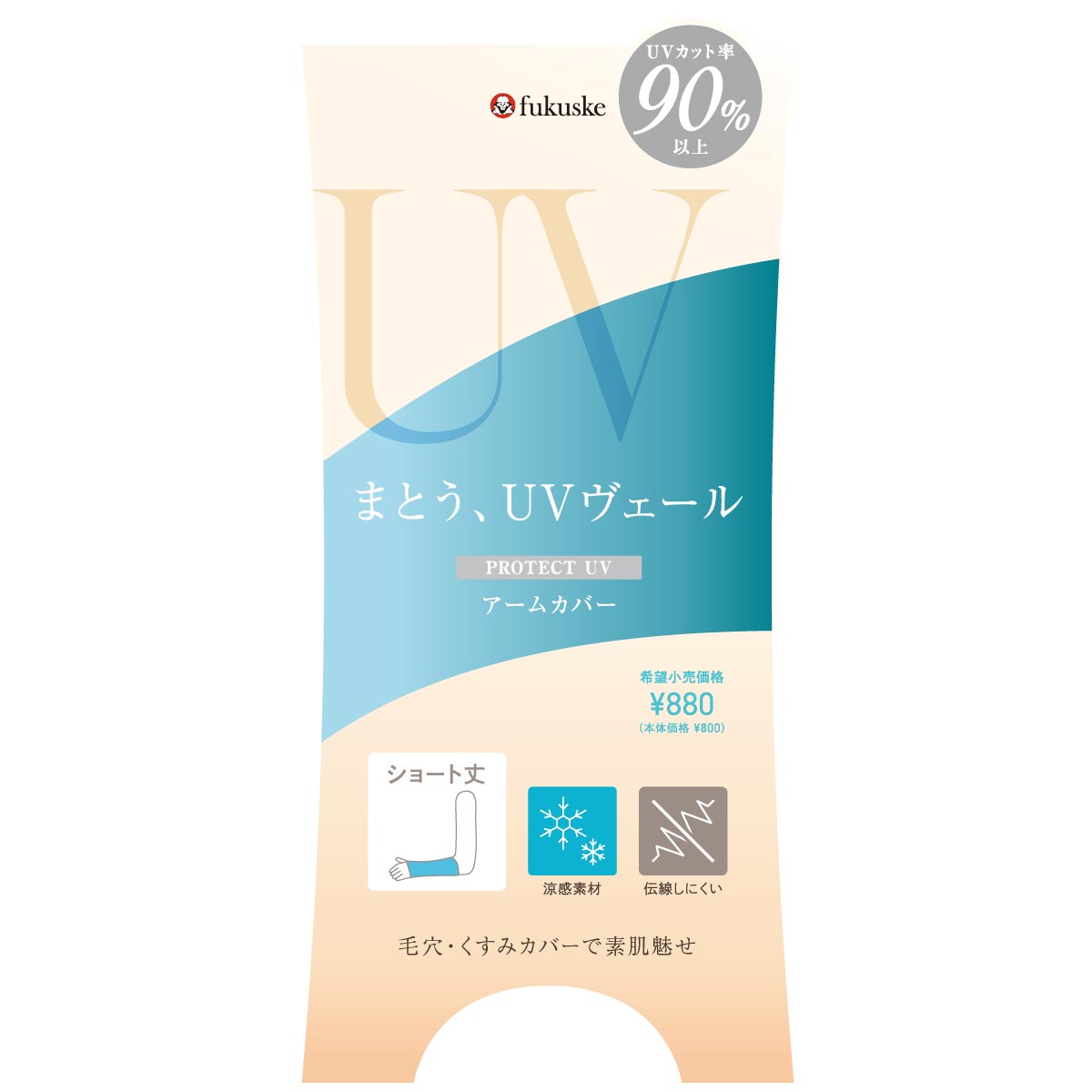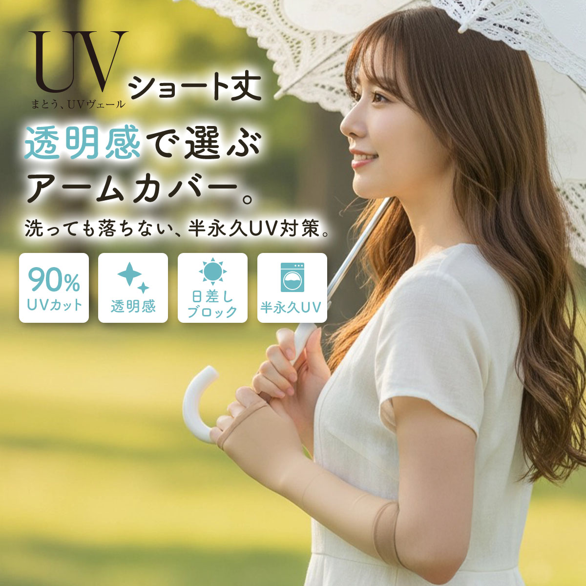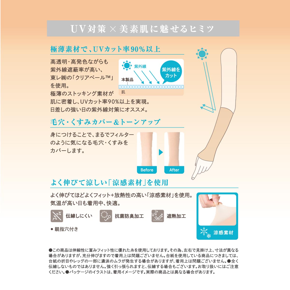 毎日の紫外線対策を、もっと手軽に。365日、絶え間なく降り注ぐ紫外線、日々忙しく過ごす中でも、紫外線対策をしたい。そんなあなたの生活に寄り添いながら、手間をかけずに肌を守る新感覚のUVケアブランドが誕生。「まとう、UVヴェール」東レ㈱の「クリアヴェール」を使用。高透明・高発色ながらも紫外線遮蔽率が高いストッキングのような極薄生地でUV遮蔽率90%以上を実現。肌に密着することで、自然な見た目でファンデーションのように気になる毛穴・キズ・くすみをカバーしてくれます。涼感素材と遮熱加工により、暑さと強い日差しの季節にピッタリです。親指穴付きでズレにくく、抗菌防臭加工でエチケット対策にもおすすめ。