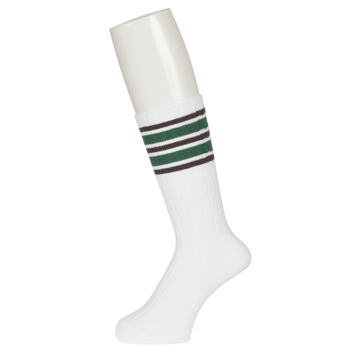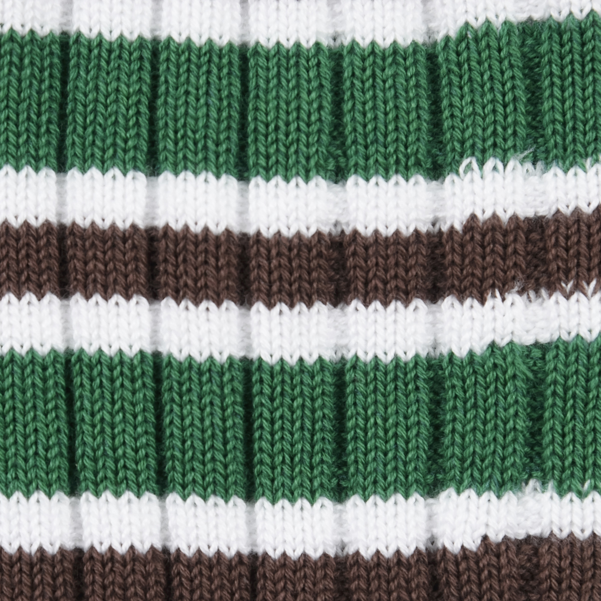 「コアラのマーチ」のパッケージを彷彿させるグリーンとブラウンのラインソックス。この2色は、ユーカリとチョコのカラーで、コアラの好きなものと人の好きなもの、という意味合いなんだとか。