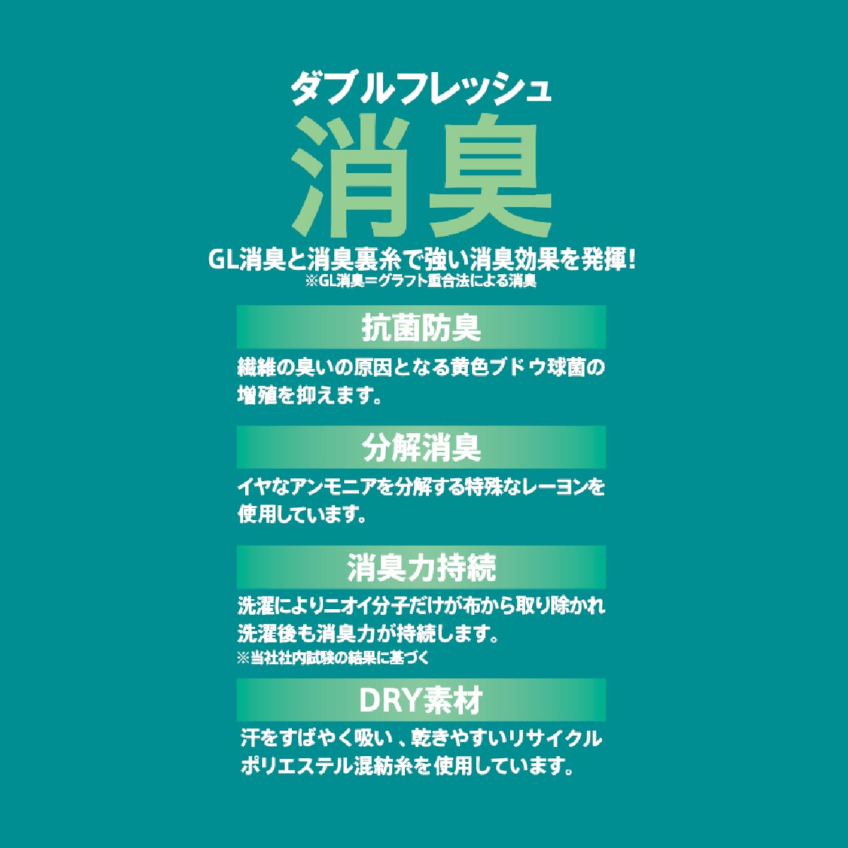 表糸と消臭裏糸で強い消臭効果を発揮するニオイ対策に特化したクルー丈ソックスです。抗菌防臭加工、消臭機能があります。洗濯によりニオイ分子だけが布から取り除かれ、洗濯後も消臭力が持続します。乾きやすいリサイクルポリエステル混紡糸を使用し、吸水速乾にも優れている1足です。口ゴムゆったりで締め付けにくいのもGOOD。