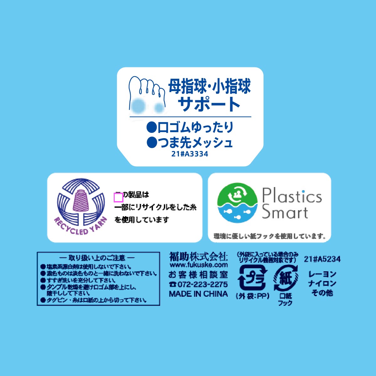 着用時にひんやり感を得られるレーヨン混紡糸を使用し、暑い季節やムレが気になる季節におすすめの冷感クールタッチシリーズです。抗菌防臭機能と分解消臭機能を備え、気になるニオイ対策も。汗をすばやく吸って乾きやすいリサイクルポリエステル混紡糸を使用し、母指球・小指球サポート機能があり、足底メッシュにすることで涼しくサラッとした履きごこちを実現しました。