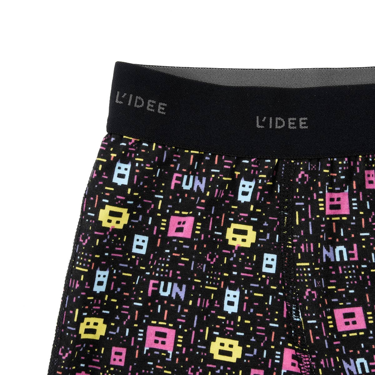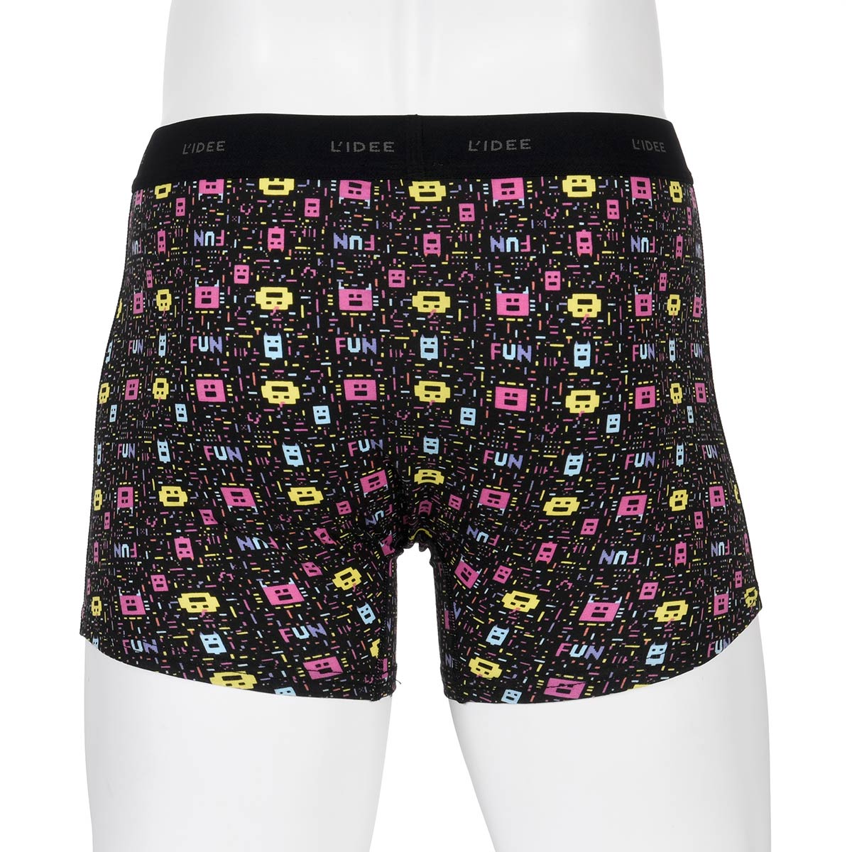 日常に「楽しさ(FUN)」をプラスする、レトロゲーム風のデザインが魅力的なボクサーブリーフです。素材には、伸縮性に優れたベア天竺生地を採用。肌触りがなめらかで、身体の動きに合わせて程よくフィットするため、一日中快適な履き心地を提供します。デザインは、ピクセルアートで描かれたキャラクターや記号が散りばめられた、ノスタルジックでポップなゲーム風の総柄プリントです。大人の遊び心をくすぐります。仕様は使いやすい前閉じタイプで、フィット感を高める幅広のウエストゴムには、ブランド名「L'IDEE」のロゴが配されています。優れた伸縮性とユニークなデザインで、見えない部分のファッションも楽しみたい方に最適な一枚です。
