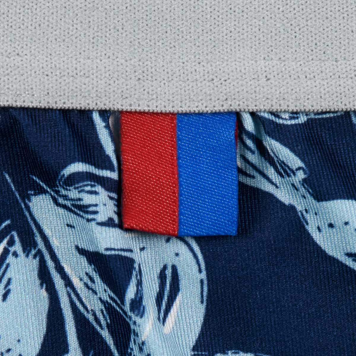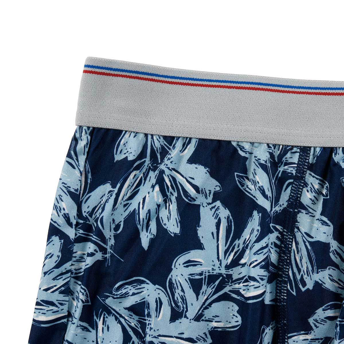 深みのある色合いと洗練されたボタニカルデザインが魅力の、大人のためのボクサーブリーフです。素材には、高い伸縮性があり、肌触りが非常に滑らかなベア天竺生地を採用しています。この抜群のフィット感により、身体の動きを妨げず、一日中快適な履き心地を提供します。デザインは、ネイビーを基調に、ブルーやオフホワイトで描かれた手描き風のボタニカル(葉っぱ)総柄プリントが特徴です。派手すぎない落ち着いた色使いで、カジュアルながらも洗練された大人の雰囲気を演出します。仕様は使いやすい前閉じタイプです。ウエストゴムは、グレーをベースに赤と青のラインが入ったトリコロール調のデザインで、さりげないアクセントになっています。また、赤と青の小さなフラッグモチーフがあしらわれており、細部にもこだわりが感じられる一枚です。