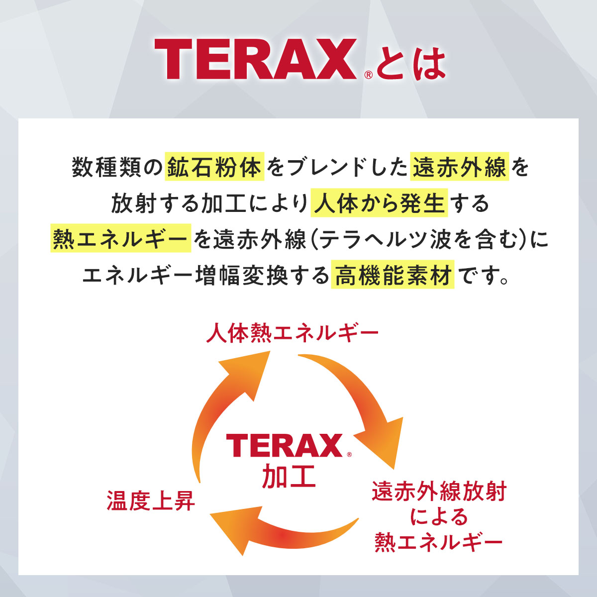 その要となるのが、最先端の技術を駆使した高機能素材「TERAX」の採用です。