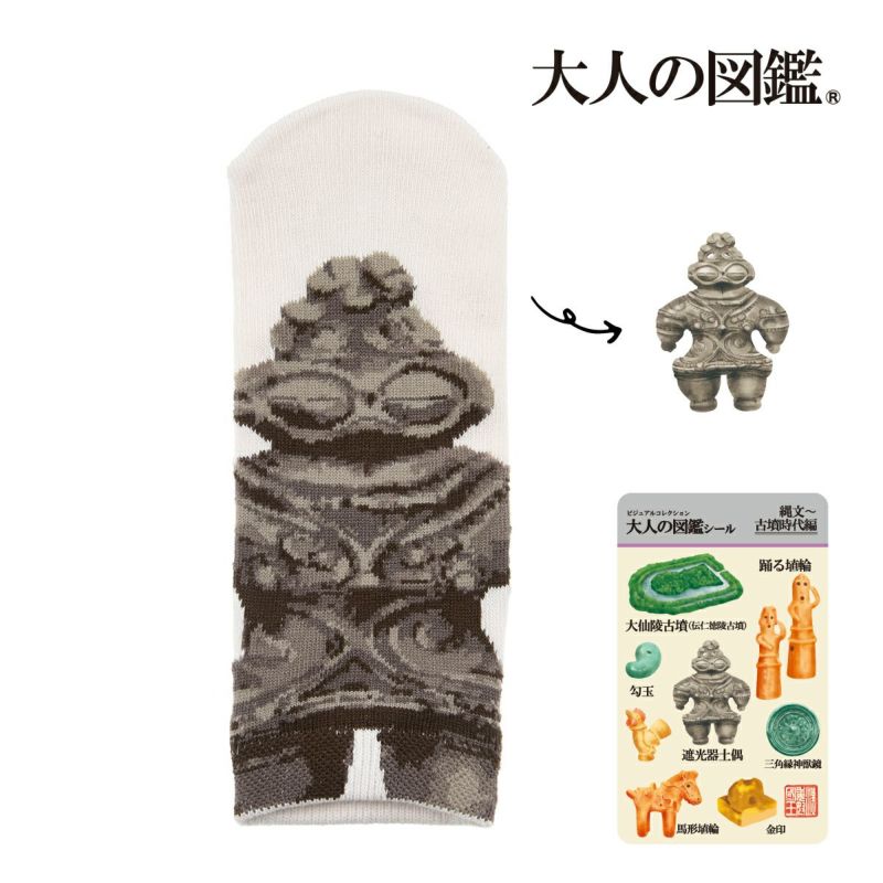 「満たして大人の好奇心」をキャッチフレーズに、ニッチなテーマを図鑑風にした【大人の図鑑】からクルー丈ソックスの登場です。遮光器土偶が大きくプリントされたインパクトのあるアイテムです。注目を集めること間違いなしです。
