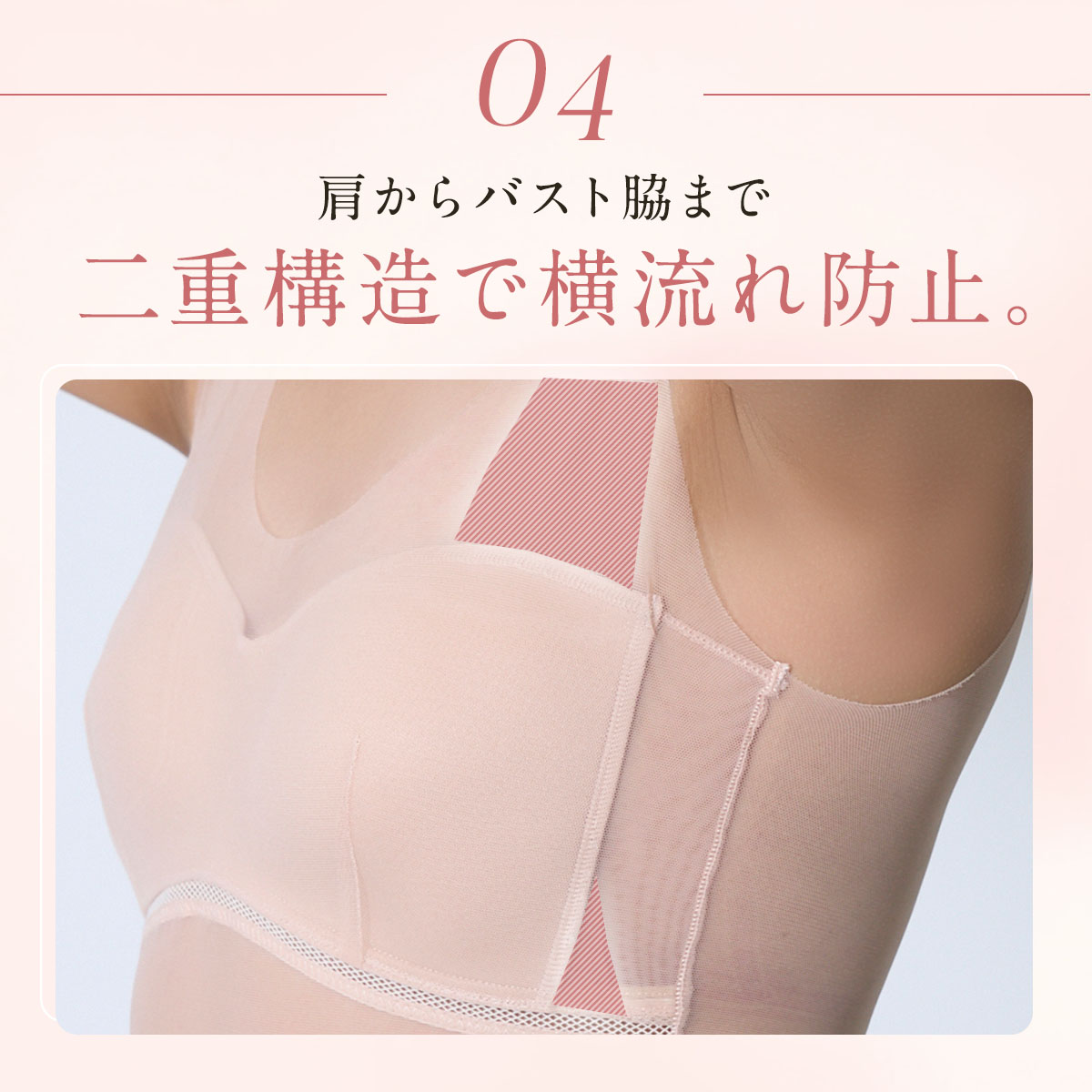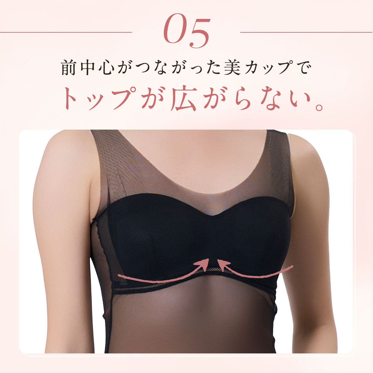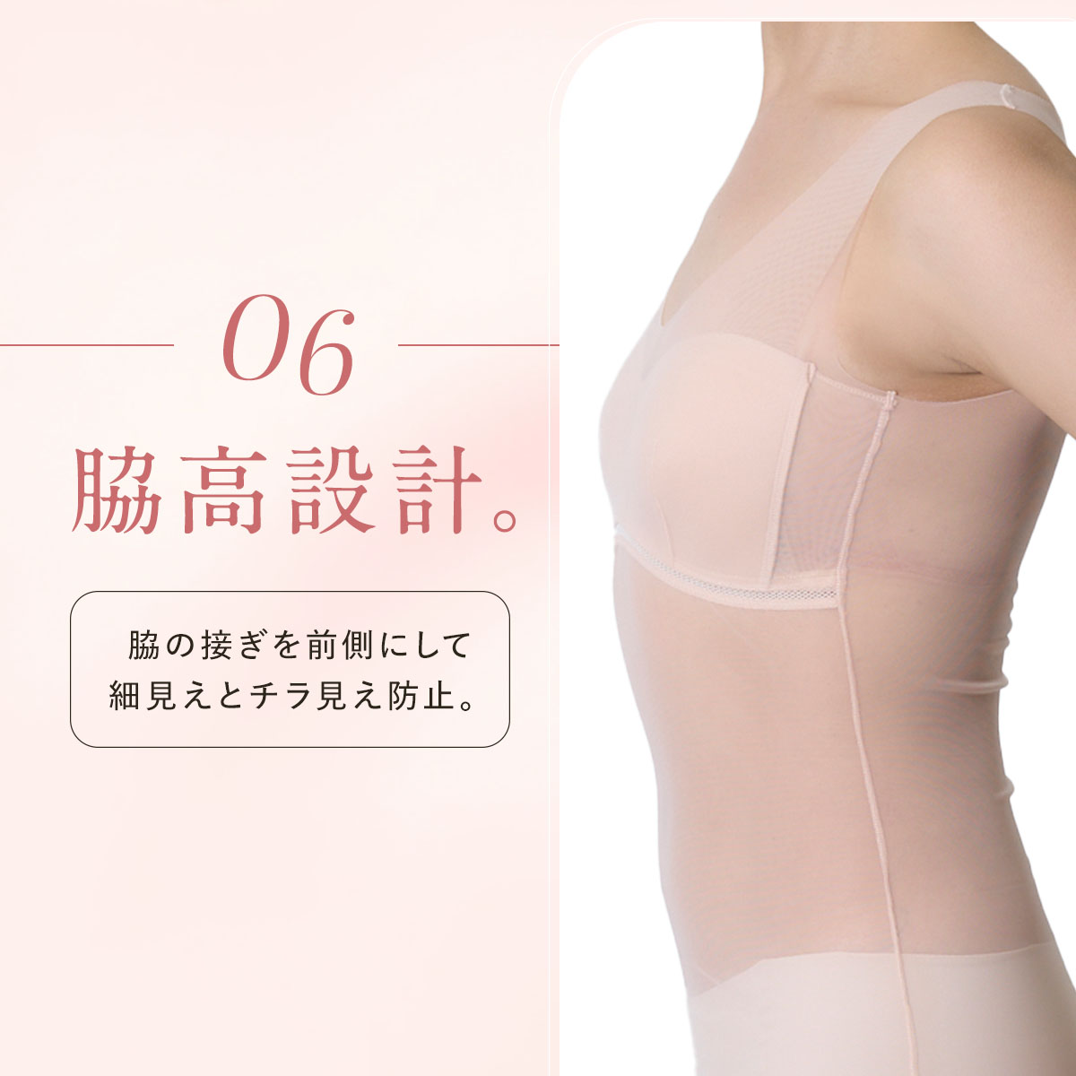 「素肌を直接魅せるのは恥ずかしい!」「美肌に見せたい」というお悩みに応え、着用する事でお肌をキレイにカバーし、まるでレタッチ効果のように見せてくれる、美カップ付きタンクトップです。肌馴染みの良いスキントーンで、インナーに悩みがちな肌魅せコーデにピッタリの一枚です。最大の特長は、軽い付け心地でありながら、美カップ付きで胸すっきりキレイ魅せと、バストをキレイに支える欲張り設計を両立させている点です。カップは脇高設計のため、就寝時や動いている時もバストが横流れしにくい構造です。さらに、カップ下にはしっかりアンダーメッシュテープを配し、安定してバストを支えます。また、カップの前中心が繋がっている設計でバストトップが広がりにくく、パワーネットパーツがバストを優しく持ち上げ、美胸に整えます。脇部分には2重パネルを配し、胸脇をスッキリと押さえて脇肉が広がりにくい設計です。このように多機能でありながら、胸部がシームレスな設計のため、薄手のトップスやぴったりしたアウターを着用してもラインが響きにくいのも魅力です。素肌をキレイにカバーしつつ、バストラインも整える、まさに理想的なインナーウェアです。