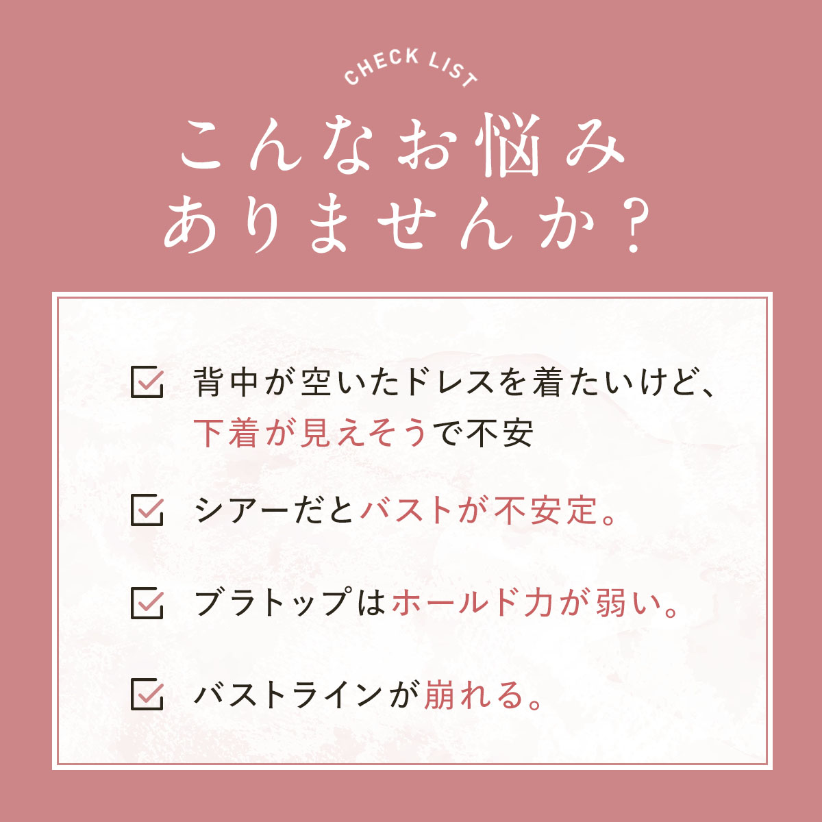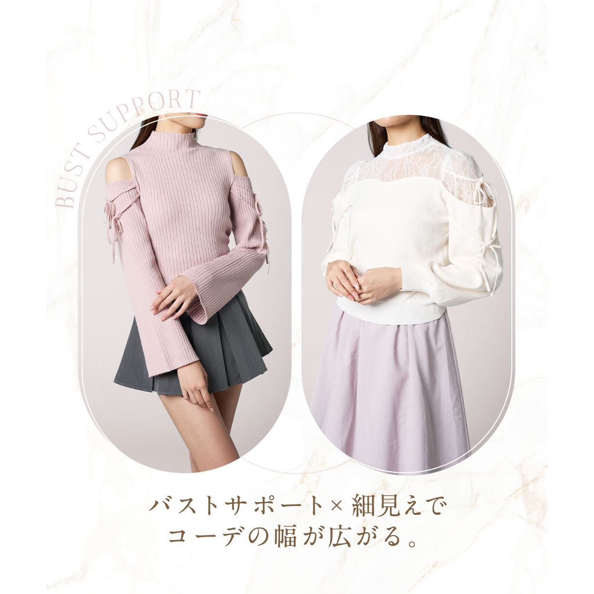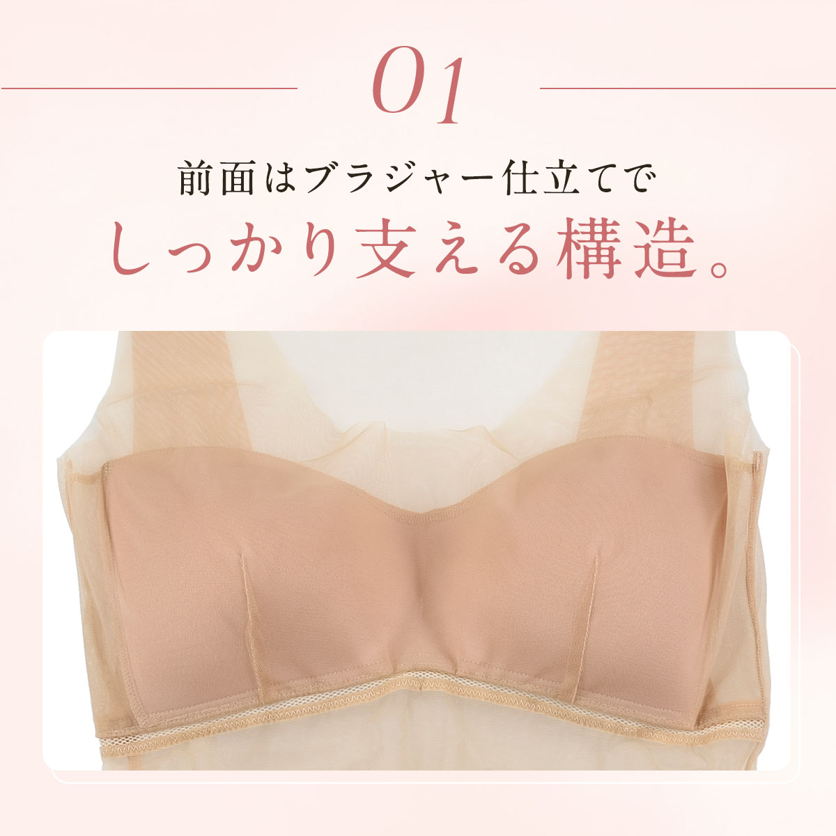 「素肌を直接魅せるのは恥ずかしい!」「美肌に見せたい」というお悩みに応え、着用する事でお肌をキレイにカバーし、まるでレタッチ効果のように見せてくれる、美カップ付きタンクトップです。肌馴染みの良いスキントーンで、インナーに悩みがちな肌魅せコーデにピッタリの一枚です。最大の特長は、軽い付け心地でありながら、美カップ付きで胸すっきりキレイ魅せと、バストをキレイに支える欲張り設計を両立させている点です。カップは脇高設計のため、就寝時や動いている時もバストが横流れしにくい構造です。さらに、カップ下にはしっかりアンダーメッシュテープを配し、安定してバストを支えます。また、カップの前中心が繋がっている設計でバストトップが広がりにくく、パワーネットパーツがバストを優しく持ち上げ、美胸に整えます。脇部分には2重パネルを配し、胸脇をスッキリと押さえて脇肉が広がりにくい設計です。このように多機能でありながら、胸部がシームレスな設計のため、薄手のトップスやぴったりしたアウターを着用してもラインが響きにくいのも魅力です。素肌をキレイにカバーしつつ、バストラインも整える、まさに理想的なインナーウェアです。