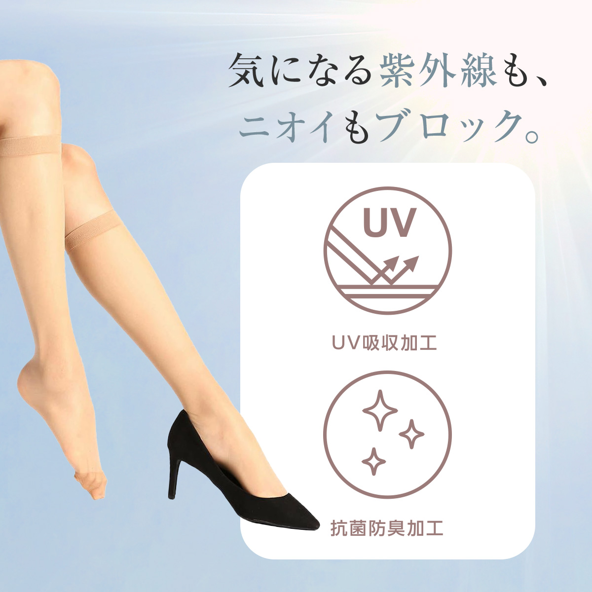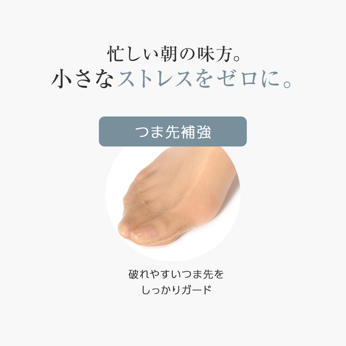 「満足」のセカンドライン「DAILY満足シリーズ」です。すべて多足組ですので、コスパ重視の方にもおすすめ。このショートストッキングは、日常の快適さと丈夫さを追求したベーシックな3足組です。素材には、伸縮性と耐久性に優れたDCY交編(ダブルカバリングヤーン)を採用しており、脚に心地よくフィットしながら、高いサポート力と丈夫さを実現しました。靴の中で摩擦を受けやすいつま先には、しっかりと補強が施されており、破れにくく耐久性が高いため、毎日のご使用に最適です。さらに、衛生面を考慮した抗菌防臭加工により気になるニオイを抑え、UV吸収加工も施されているため、足元の紫外線対策としてもご活用いただけます。便利な3足組でお届けしますので、洗い替えに困ることなく、高いコストパフォーマンスでご使用いただけます。日常使いのパンプスやスニーカーと合わせて、快適な足元のおしゃれをお楽しみください。