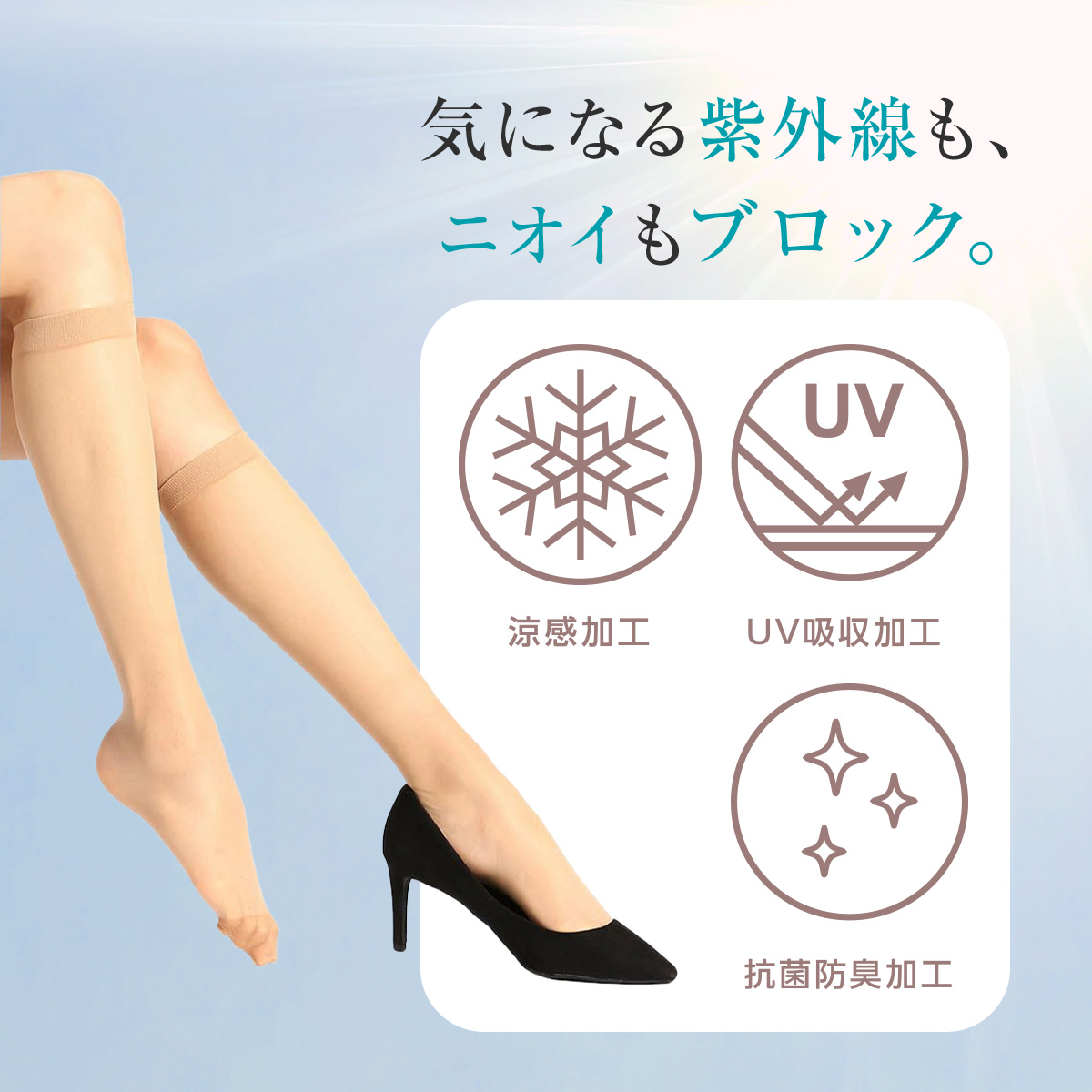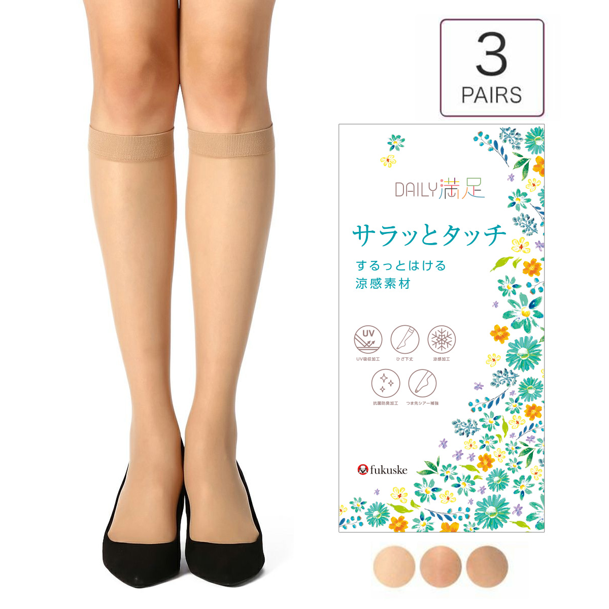 「満足」のセカンドライン「DAILY満足シリーズ」です。すべて多足組ですので、コスパ重視の方にもおすすめ。このショートストッキングは、暑い季節の足元を涼しく、美しく保つために機能性を凝縮した3足組です。素材には、なめらかな肌触りのナイロンゾッキ編みを採用し、心地よいフィット感を実現しています。最大の特長は、暑さ対策として涼感加工が施されている点です。これにより、着用時にひんやりとした感触があり、夏の足元のムレを軽減します。耐久性にも配慮し、摩擦を受けやすいつま先にはシアー補強が施されています。見た目の透明感を保ちつつ、破れにくさを向上させています。また、抗菌防臭加工により気になるニオイを抑え、さらにUV吸収加工も施されているため、日差しの強い季節の紫外線対策としても安心してお使いいただけます。大変お得で便利な3足組でのお届けですので、洗い替えに困ることなく、毎日の必需品としてご活用いただけます。パンプスやサンダルなどと合わせて、夏の足元のおしゃれを快適にお楽しみください。