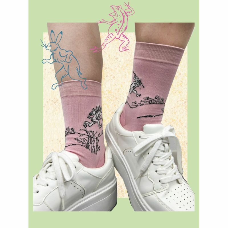約800年前に描かれた日本で最も有名な絵巻で現代のマンガのルーツとも言われている『国宝・鳥獣戯画』をモチーフにしたクルー丈ソックスです。右足と左足を並べると有名な絵巻の一部になるユニークな一足です。