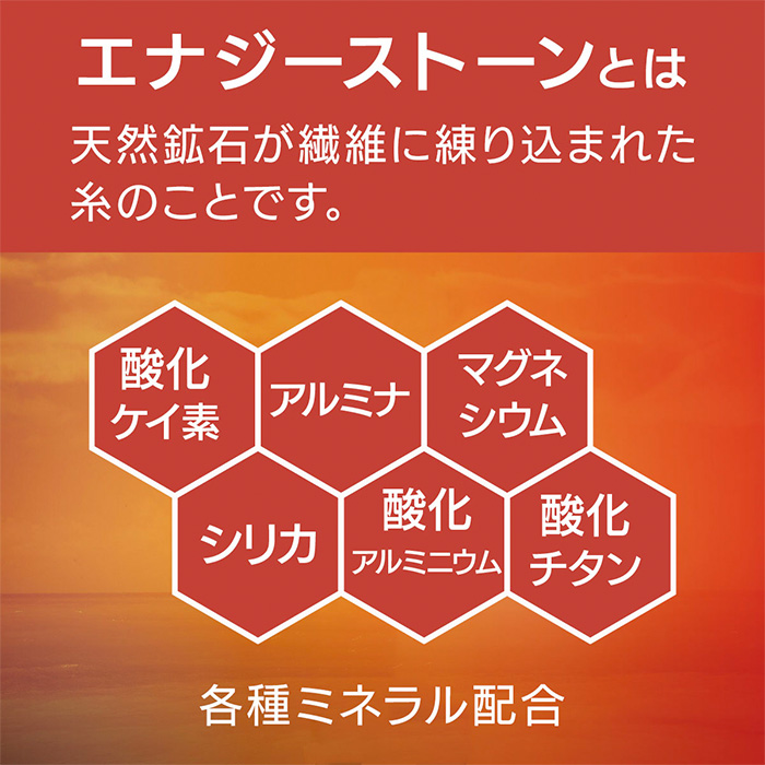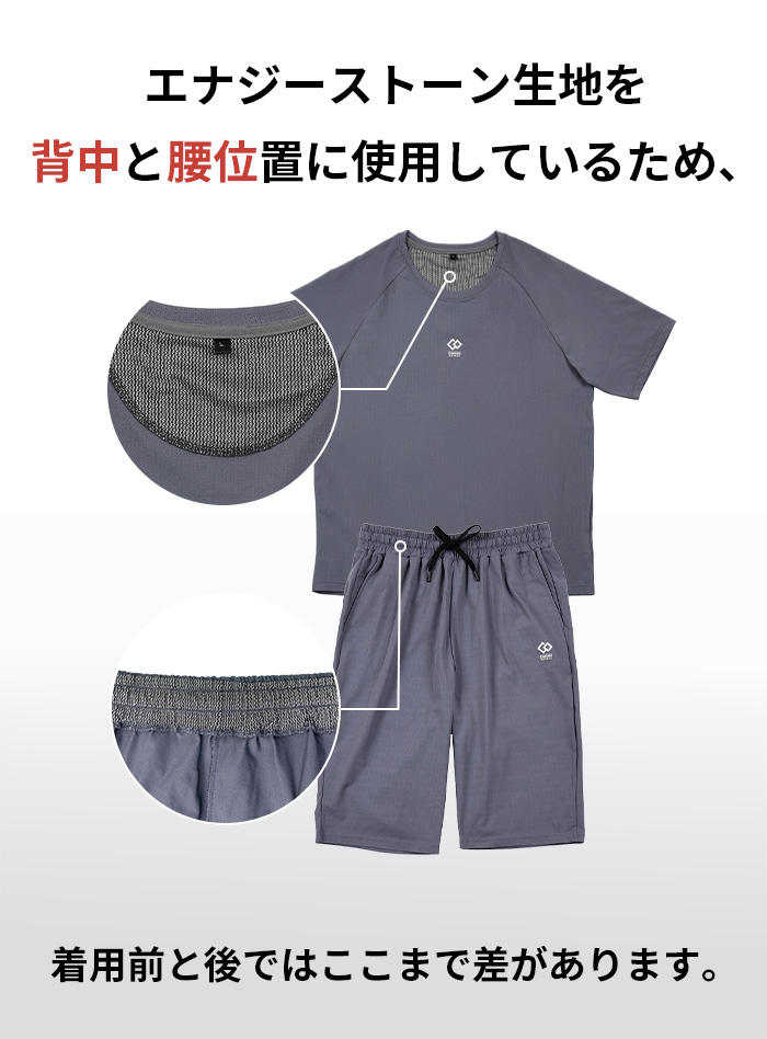 天然鉱石を練り込んだエナジーストーン生地を、トップスの背当てとパンツの腰あて部分に使用しています。エナジーストーンの効果でリラックスや快適をサポートしてくれ、ルームウェアやちょっとしたスポーツにおすすめのウェア上下セットです。