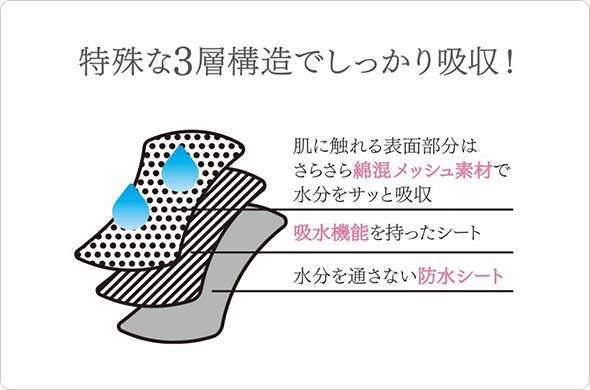 中には水分を吸う吸水体が、一番外側には漏れても安心できる防水シートの3層構造です。