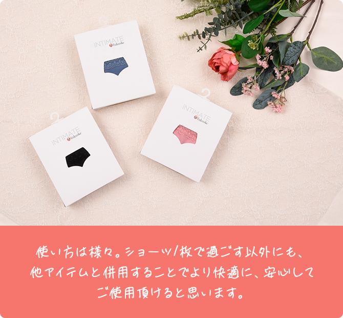 その名の通り、ショーツが水分を吸収するため、ブルーな期間でもショーツ1枚で過ごすことが出来るアイテム。ご自身の体調に合わせてナプキン等他アイテムとの併用もおすすめします。
