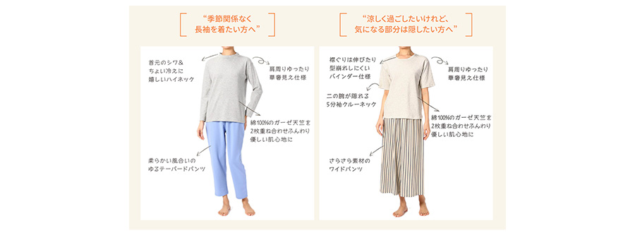 ルームウェアを選ぶときは、一年を通して肌触りや着心地がよいものを選びましょう。