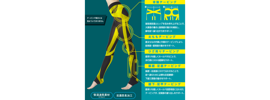 テーピング設計が特徴で、骨盤や足全体をサポートしてくれます。足全体の引き締め感や着圧力を重視したい方に良いでしょう。