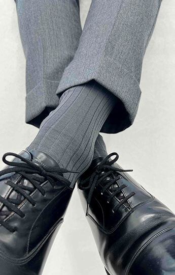 様々なスーツと相性が良く、飽きが来ない定番にして万能なリブソックス。6:2のリブが縦長のシャープで美しいラインを作り、座ったときにソックスが見えてもきれいな印象を与えます。スーツのカラーと揃えることでスラックスから途切れることのないラインが構築され、よりまとまった足元を演出できます。