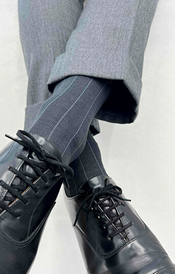 間隔を置きながら繊細なストライプを入れることでオーセンティックな印象に仕上げました。縦に伸びるラインがシャープな印象を与え、足元をきれいにまとめてくれます。リブのような凹凸感はないため、より一層すっきりとしたスーツスタイルにマッチします。