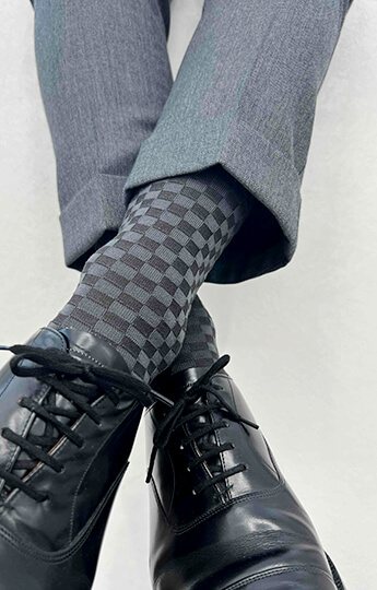 日本の伝統柄である市松模様のドレスソックスです。光沢のある素材に凹凸感を持たせて編むもとで、陰影で柄がきれいに見えます。また、裏糸の色を変えることで程よく上品な色合いになり、コーディネートを引き立ててくれます。