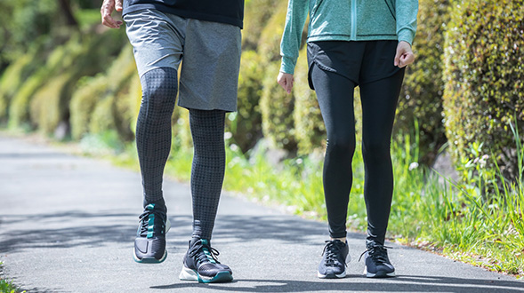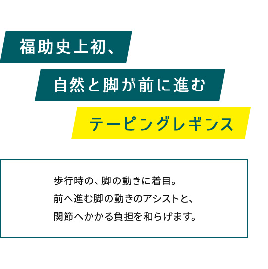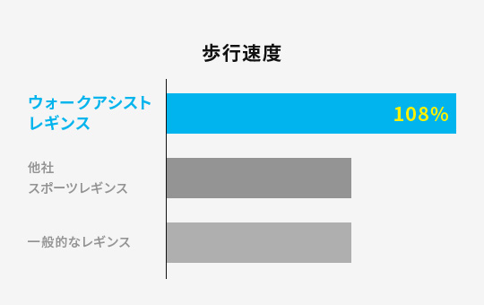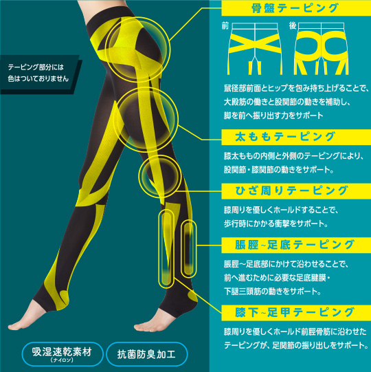 レギンスは、股関節が前に振り出す力を股関節の前の部分で作っています。それ以外にもお尻や太ももの裏、脹脛の筋肉をサポートすることで、ブレーキの機能を作っています。これらの両方がちゃんと機能することで、歩行速度UPや股関節が振り出しやすくなるデータがとられています。